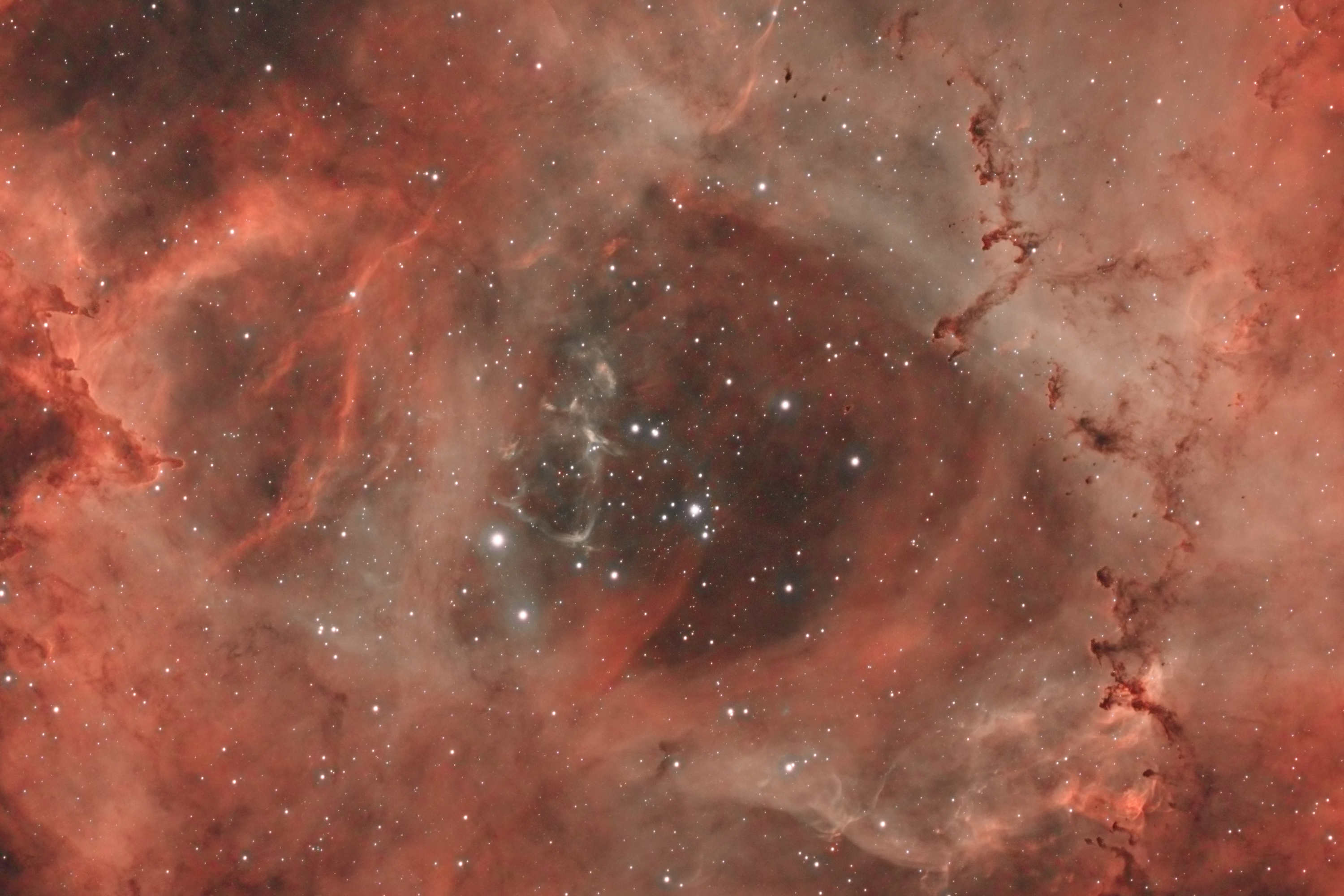 Der Kernbereich des Rosettennebels, der offene Sternhaufen NGC 2244 als H-Alpha-RGB-Komposit vom 21. Februar 2021. Die H-Alpha-OIII-verstärkten RGB-Aufnahmen stammen aus dem Jahr 2011.