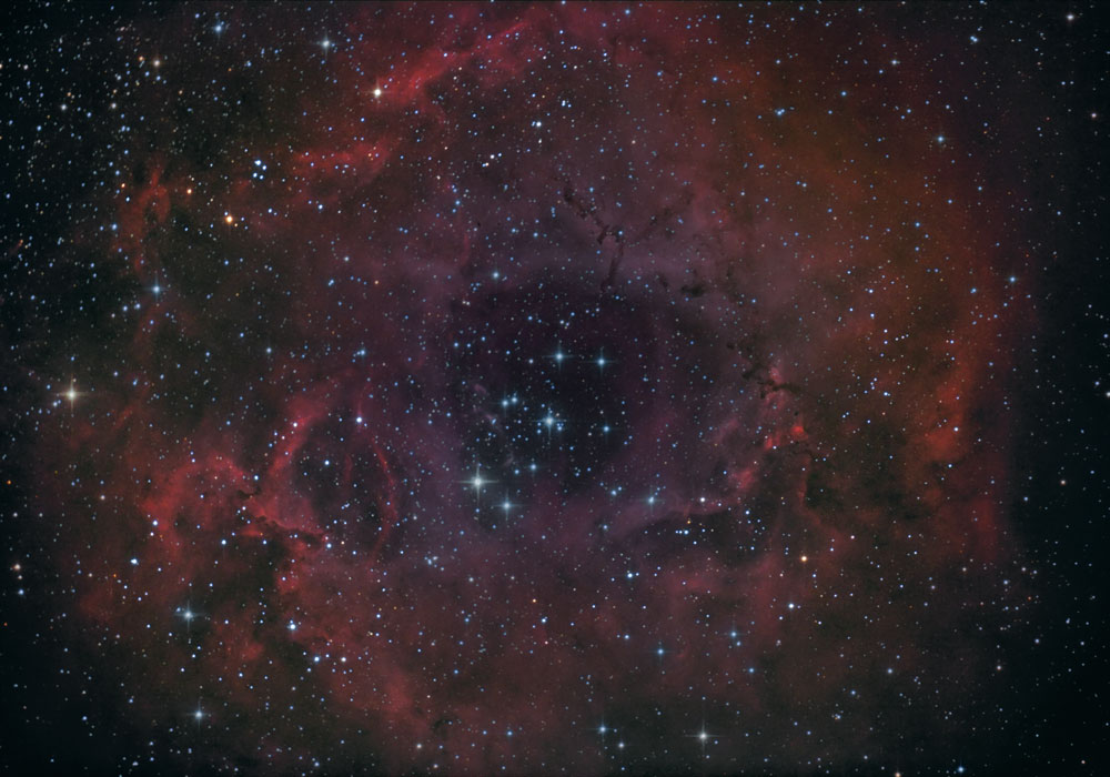 NGC 2244 aufgenommen mit Canon 1300Da, 150/750 Skywatcher PDS, IDAS LPS Filter, H-Alpha-RGB-Komposit.