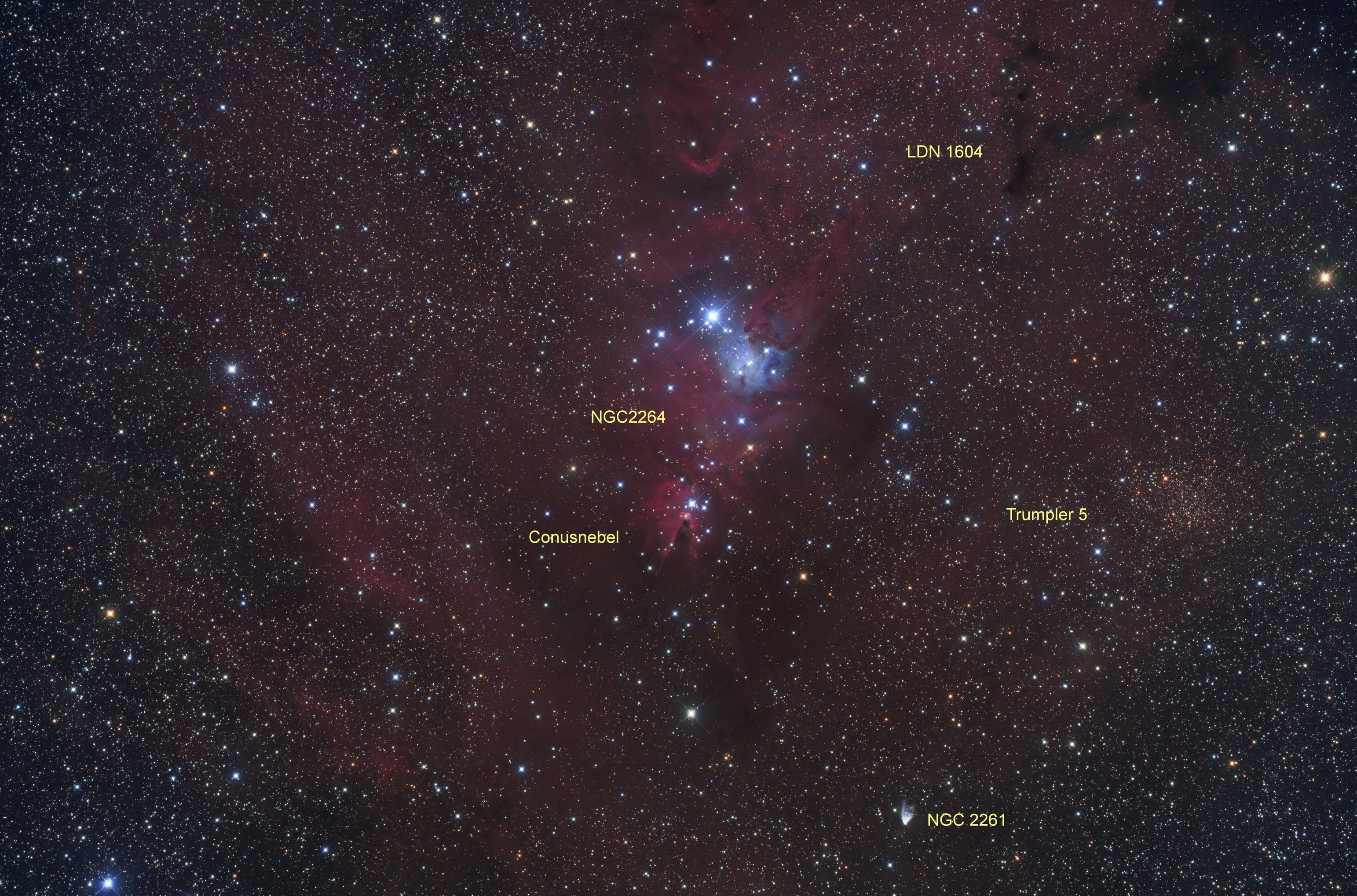 NGC 2264 beschreibt ein Gebiet, das aus einem Teil eines H-II-Gebiets (mit einer davor liegenden Dunkelwolke, dem Konusnebel), einem Sternhaufen (dem Weihnachtsbaum-Sternhaufen) und dem diffusen Nebel dazwischen besteht. Es befindet sich in etwa 2500 Lichtjahren Entfernung im Sternbild Einhorn. Im Bild befindet sich auch der alte offene Sternhaufen Trumpler 5. NGC 2261 (auch Hubbles Variabler Nebel oder Caldwell 46) ist ein variabler Reflexionsnebel im Sternbild Einhorn und etwa 2600 Lichtjahre von uns entfernt. Er wird durch den jungen Riesenstern R Monocerotis vom Spektraltyp B0 beleuchtet, der aber selbst nicht sichtbar ist. Der Nebel hat eine Ausdehnung von rund einem Lichtjahr.