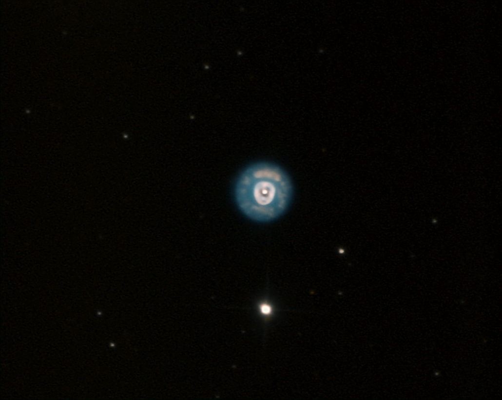 Ein schöner, aber nicht einfach zu fotografierender Planetarischer Nebel. Es handelt sich um ein HA-OIII Komposit aus jeweils 30 gestackten Bildern mit einer Belichtungszeit von jeweils 30 Sekunden.