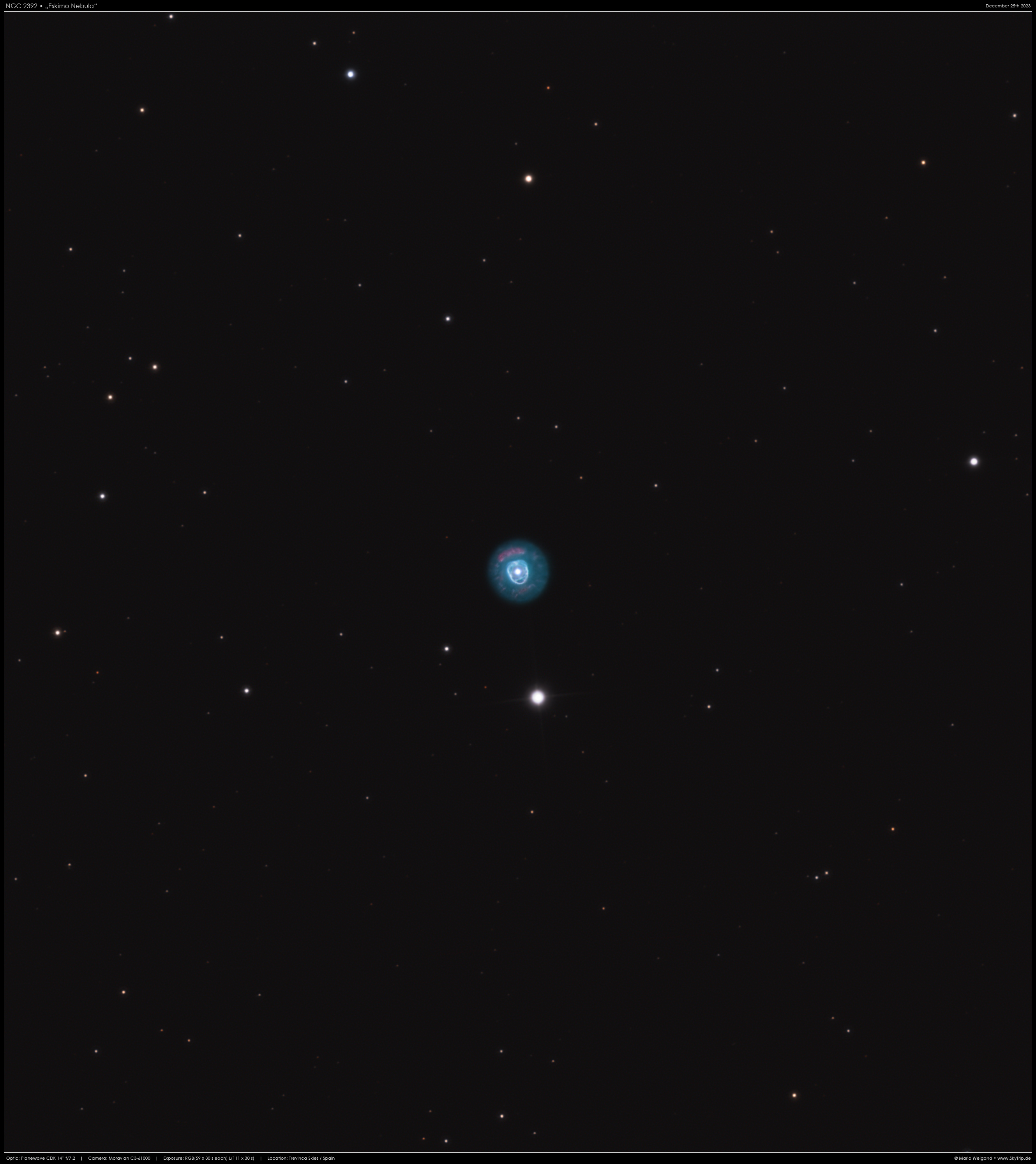 Der Eskimonebel (auch als NGC 2392 bezeichnet) ist ein Planetarischer Nebel im Sternbild Zwillinge. Er hat eine Größe von 0,8 × 0,7 Bogenminuten und hat eine scheinbare Helligkeit von +8,60 mag und ist somit leicht in kleineren Teleskopen sichtbar. Der Nebel ist vor etwa 10000 Jahren entstanden, als der etwa sonnengroße Zentralstern seine äußere Hülle durch eine Eruption abgeworfen hat. Die Entfernung zum Eskimonebel beträgt etwa 5000 Lichtjahre. Die Aufnahme entstand mit einem Remote-Teleskop in Spanien. Insgesamt wurden rund 2,4 Stunden in 30 s Subframes mit der Moravian C3-61000 am Planewave CDK 14 Zoll belichtet. http:/www.skytrip.de