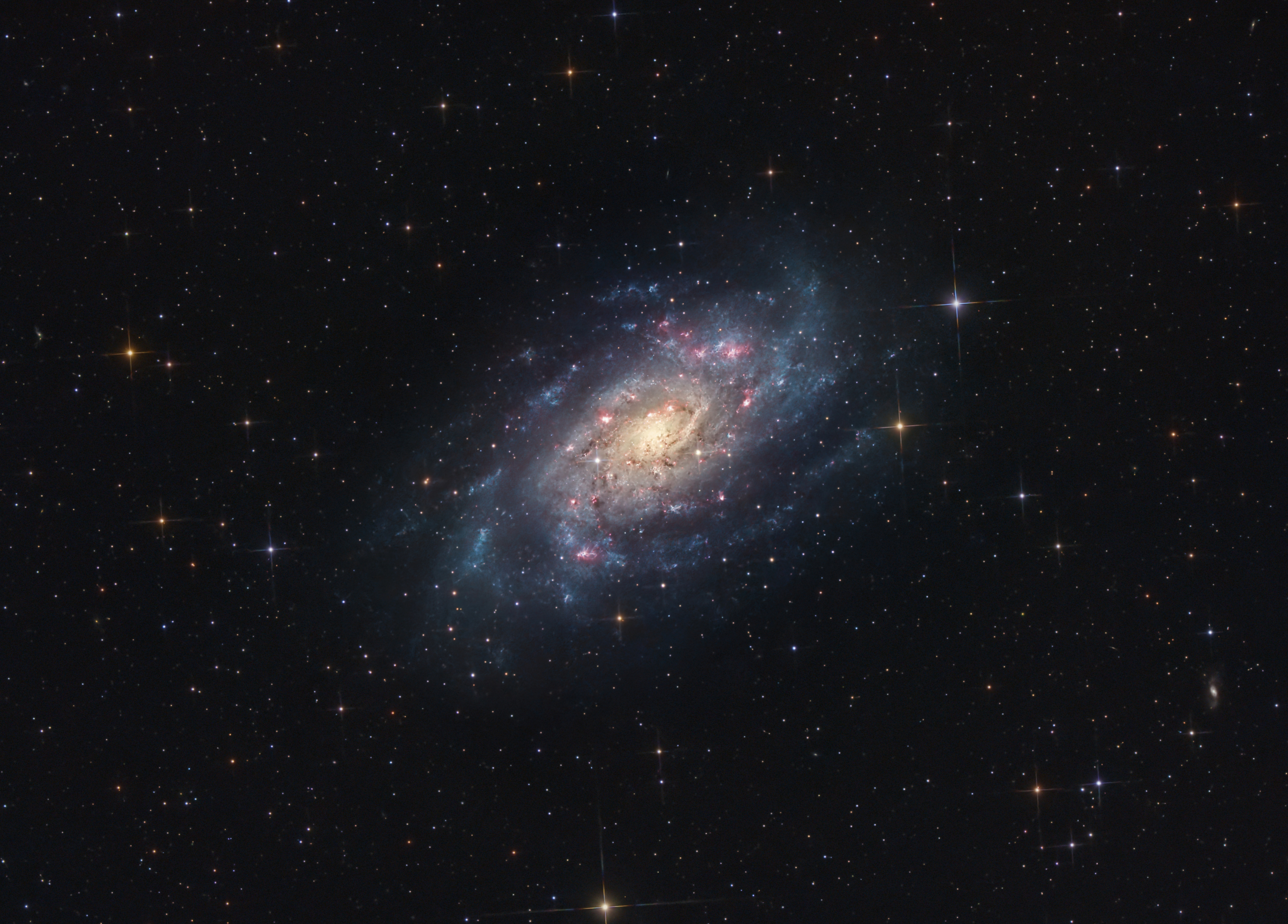 NGC 2403 ist eine sehr schöne Galaxie im Sternbild Giraffe, deren Erscheinungsbild an die Dreiecksgalaxie M33 erinnert. Im Vergleich wirkt sie durch ihre Entfernung von rund acht Millionen Lichtjahren kleiner, ist aber tatsächlich deutlich größer als M 33 (etwa 2,7 Millionen Lichtjahre entfernt). Dank fünf klaren Nächten am Stück, konnte ich mit meinem f/5-Newton bei 950 mm Brennweite insgesamt etwas über 30 Stunden Belichtungszeit sammeln, aufgeteilt in 23,5 Stunden RGB und 6,5 Stunden H-Alpha. Die H-Alpha-Daten habe ich nach der Kontinuumreduktion relativ vorsichtig in das Bild integriert, damit sie nicht die gesamte Aufmerksamkeit auf sich ziehen und den Gesamteindruck zerstören.
