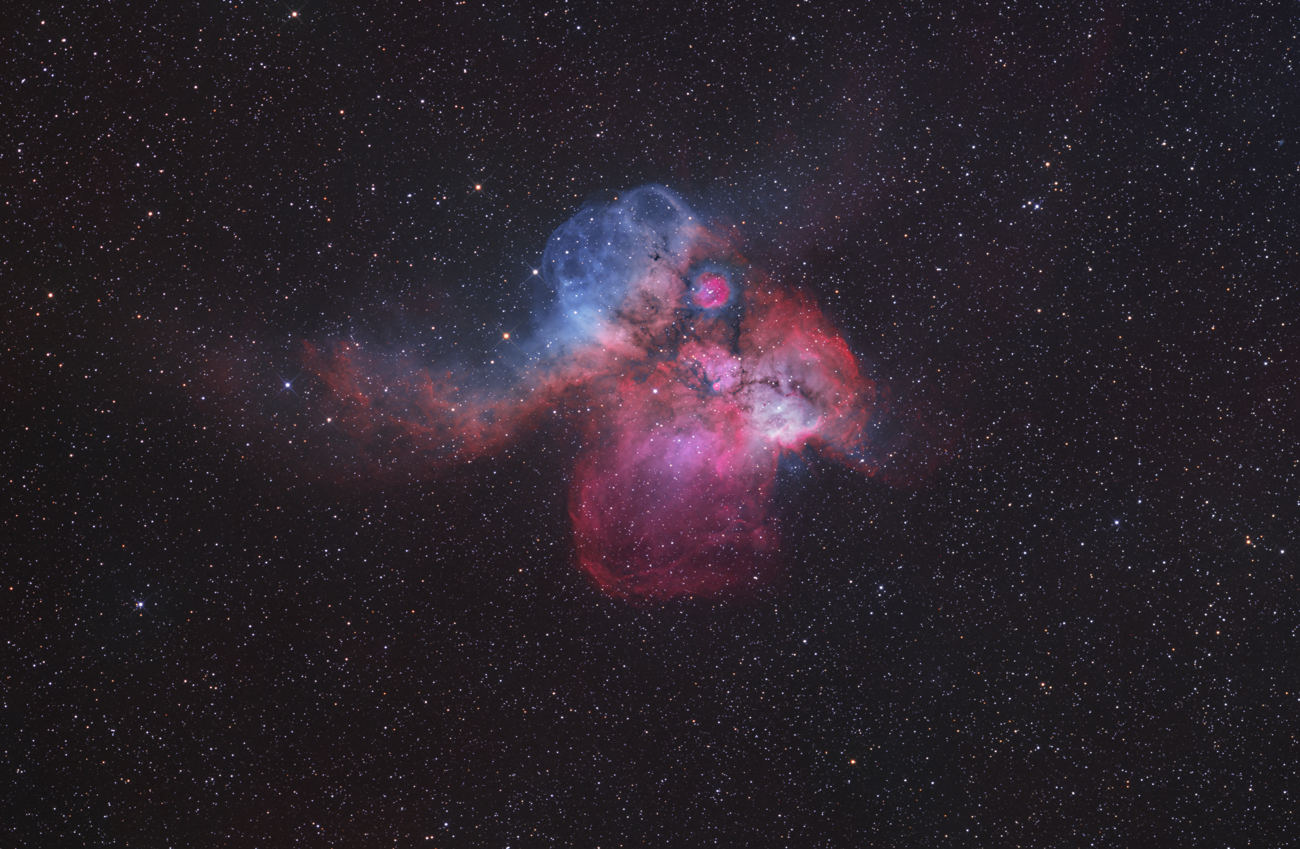 Nach vielen Wochen namibischer Regenzeit ist nun der Himmel wieder wolkenfrei und die ersten Aufnahmen konnten erstellt werden. Das Bild hier zeigt den Sternhaufen NGC 2467 im südlichen Sternbild Hinterdeck. Der Sternhaufen befindet sich noch in einem Kokon aus Gas und Staub, in dem seine Sterne entstanden sind.