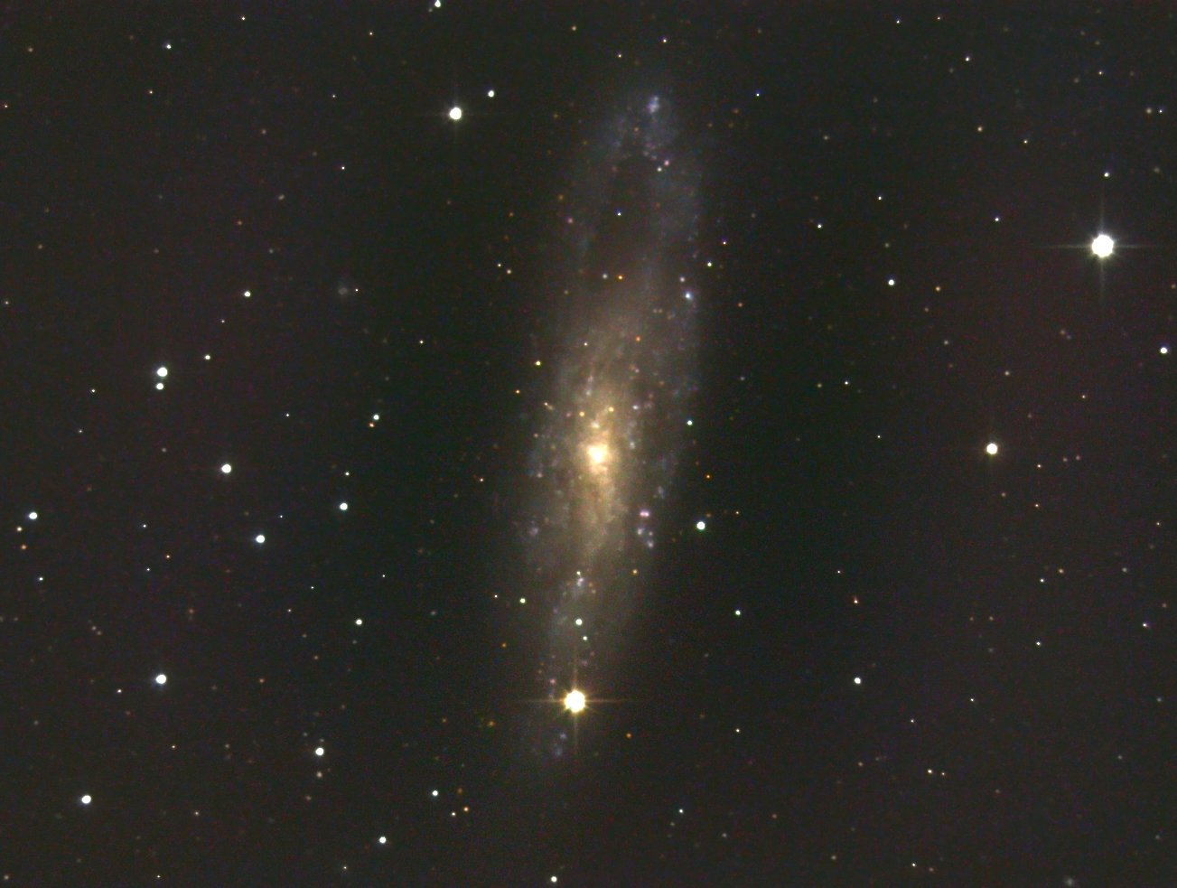 Nur drei Grad südlich von Deneb Kaitos (Beta Ceti) bei Deklination -21 Grad und 4,6 Grad nördlich der Silberdollargalaxie NGC 253 liegt diese interessante, aber weniger fotografierte Galaxie.Dabei ist sie mit 21 x 6 Bogenminuten nur 20% kleiner als diese. Sie ist nur neun Millionen Lichtjahre entfernt und gehört der Sculptor Galaxiengruppe an. Vom Hubble-Typ SBcd(HII) besitzt sie nur einen kleinen Bulge, aber viele Sternentstehungsregionen (HII). Der lineare Durchmesser beträgt etwa 50000 Lichtjahre. Entdeckt wurde sie 1784 von W. Herschel.