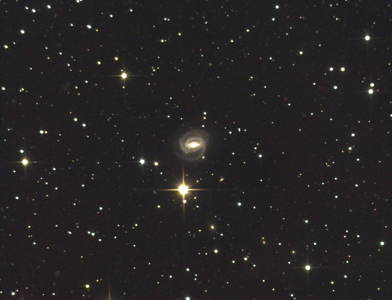 An der Grenze Pisces-Andromeda liegt diese eindrucksvolle Balkenspirale, die an NGC 1300 im Eridanus erinnert. Vom Typ SB(rs)ab mit einer Quasiringstruktur um den Balken und nicht allzu weit ausladenden Spiralarmen, gehört sie zu den Seyfert-Galaxien vom Typ 2 mit einem AGN. Scheinbare Helligkeit 12,0 mag, scheinbarer Durchmesser 3 x 2,9 Bogenminuten, ihr linearer Durchmesser beträgt 190000 Lichtjahre! Die Entfernung beträgt dabei rund 200 Millionen Lichtjahre. 2005 erschien eine 15,6 mag helle Supernova in Kernnähe.. Entdeckt wurde die Galaxie 1784 von W. Herschel. 2007 und 2013 nahm ich diese Galaxie bereits auf, vorgestern war es ausnahmsweise wolkenlos und ich hielt weitere 2,5 Stunden drauf, insgesamt 7h 15 min.