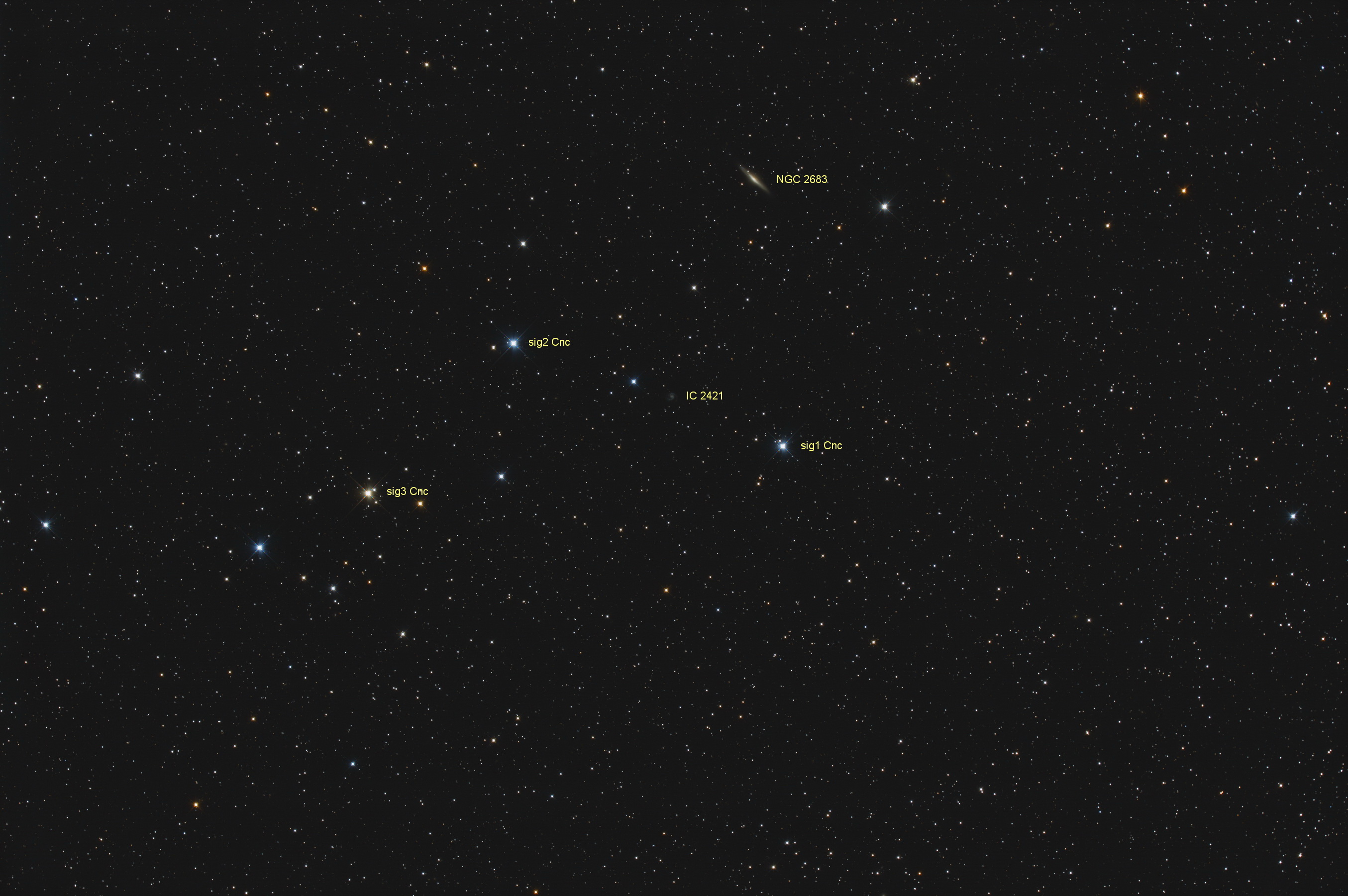Im Sternbild Luchs findet sich die "UFO-Galaxie" NGC 2683, im Krebs die benachbarte Galaxie IC 2421, etwa 194 Millionen Lichtjahre entfernt und mit einem Durchmesser von 115000 Lichtjahren.