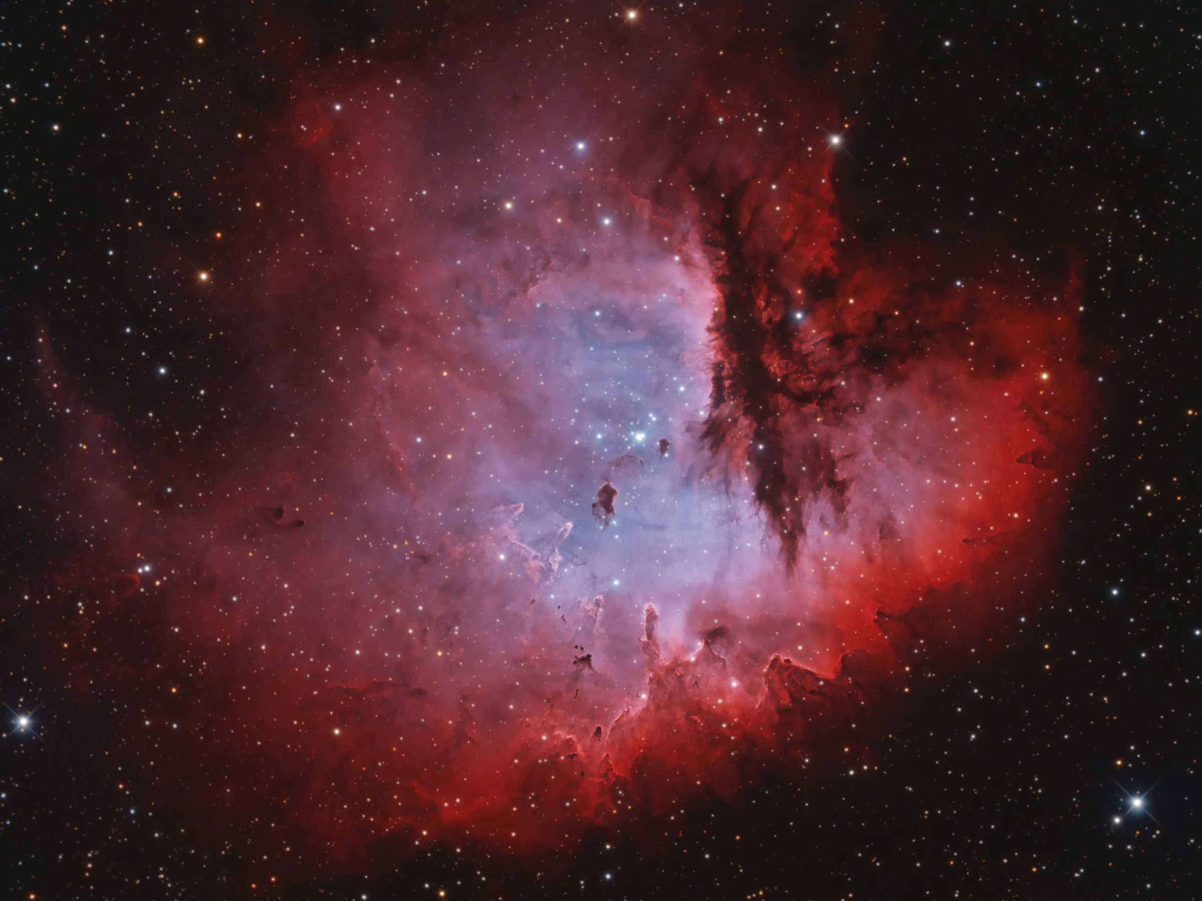 Überraschenderweise klarte es Neulich auf und ich habe die Chance genutzt, um ein weiteres Objekt meiner To-Do-Liste zu belichten. Es handelt sich dabei um NGC 281, den Pacman-Nebel. Dieser steht in einer Entfernung von 9500 Lichtjahren im Sternbild Kassiopeia und ist relativ hell, sodass ich versuchen wollte, ihn in einer Nacht fertig zu belichten. Innerhalb des Emissionsnebels gibt es den offenen Sternhaufen IC 1590, dessen massereiche Sterne hier geboren wurden und die Energie für das Leuchten des Nebels liefern. Die auffällige Silhouette von NGC 281 zeigt staubige Säulen und dichte so genannte Bok-Globulen die von den energiereichen Winden der heißen Haufensterne erodiert wurden. Bok-Globulen, nach ihrem Entdecker Bart Bok benannt, sind Objekte, in denen Sterne neu entstehen, aber sich noch lange vor der Frühphase der Sternentwicklung befinden. Diese Erkenntnis konnte erst mit Hilfe der Infrarot-Fotografie gewonnen werden, die es erlaubte, weit in diese kompakten Molekülwolken vorzudringen. Bei der Bearbeitung der Schmalbanddaten habe ich mich ein wenig schwer getan. Ich habe für die farbliche Zuordnung noch immer kein Patentrezept für mich gefunden. Es gibt gefühlt unendlich viele Variationsmöglichkeiten und geben dem Objekt jeweils ein ganz unterschiedliches Erscheinungsbild. Nach vielen Versuchen bin ich wieder zu meiner alten Methode zurückgekehrt. Irgendwie kann ich mich damit am besten arrangieren. Letztendlich ist es sowieso reine Geschmacksache und muss keinem wissenschaftlichen Anspruch genügen. Zusätzlich zu den Schmalbandaufnahmen habe ich noch kurzbelichtete RGBs für die Sternfarben verwendet. Für die Aufnahme erforderte das Objekt eine Hochformatausrichtung meiner Kamera, dennoch möchte ich sie hier im Querformat vorstellen, mit der Nordrichtung auf 9 Uhr. Erstens passt sie so besser ins Format der Monitore und zweitens bekommt der Nebel nach meinem Empfinden eine gewisse räumliche Tiefe und erinnert an den Eingang einer lichtdurchfluteten Höhle.