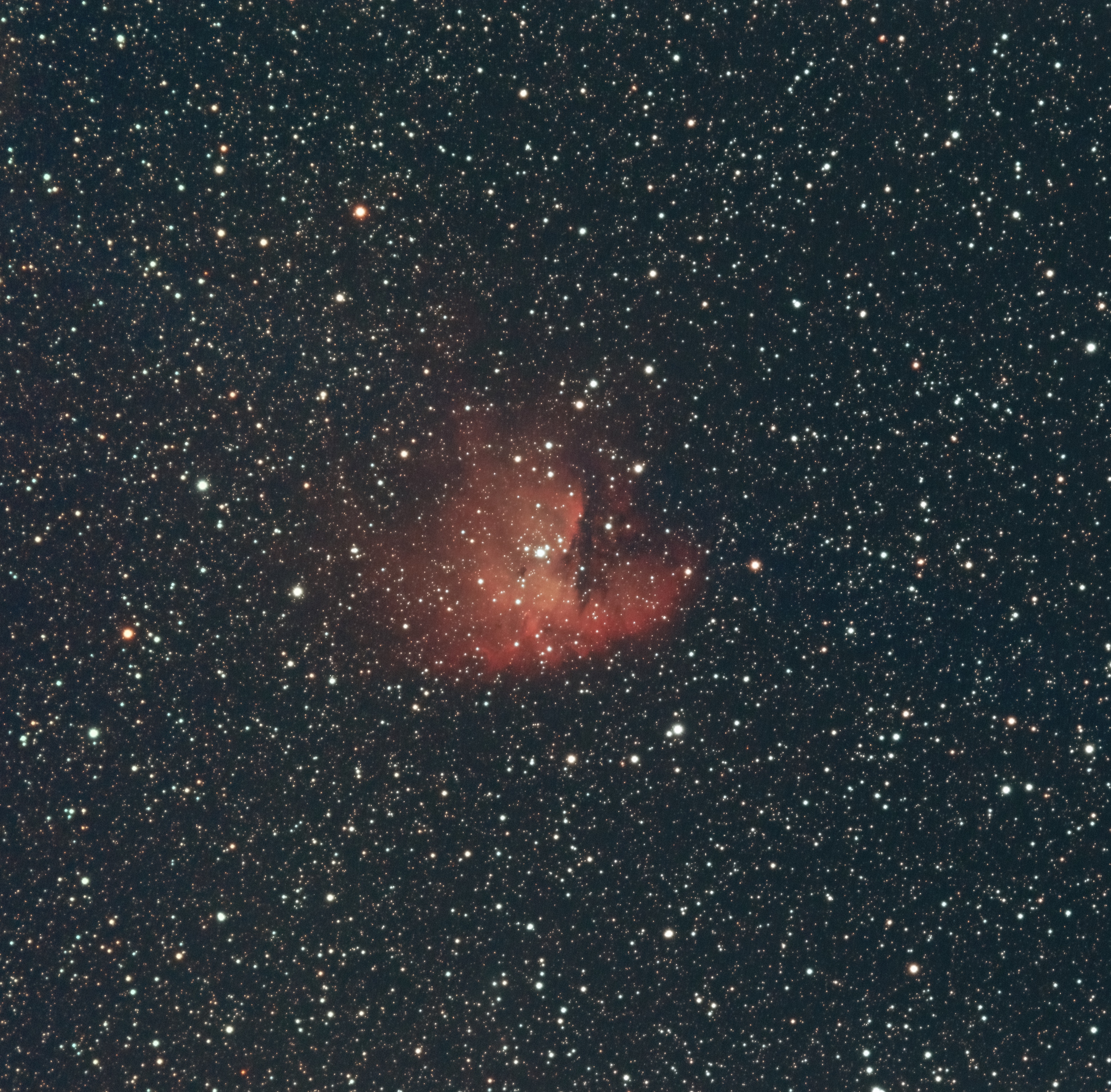 NGC 281, der Pac-Man-Nebel im Sternbild Kassiopeia. Entfernung ca. 9500 Lichtjahre. Ein Emissionsnebel, in dem der offene Sternhaufen IC 1590 eingebettet ist.