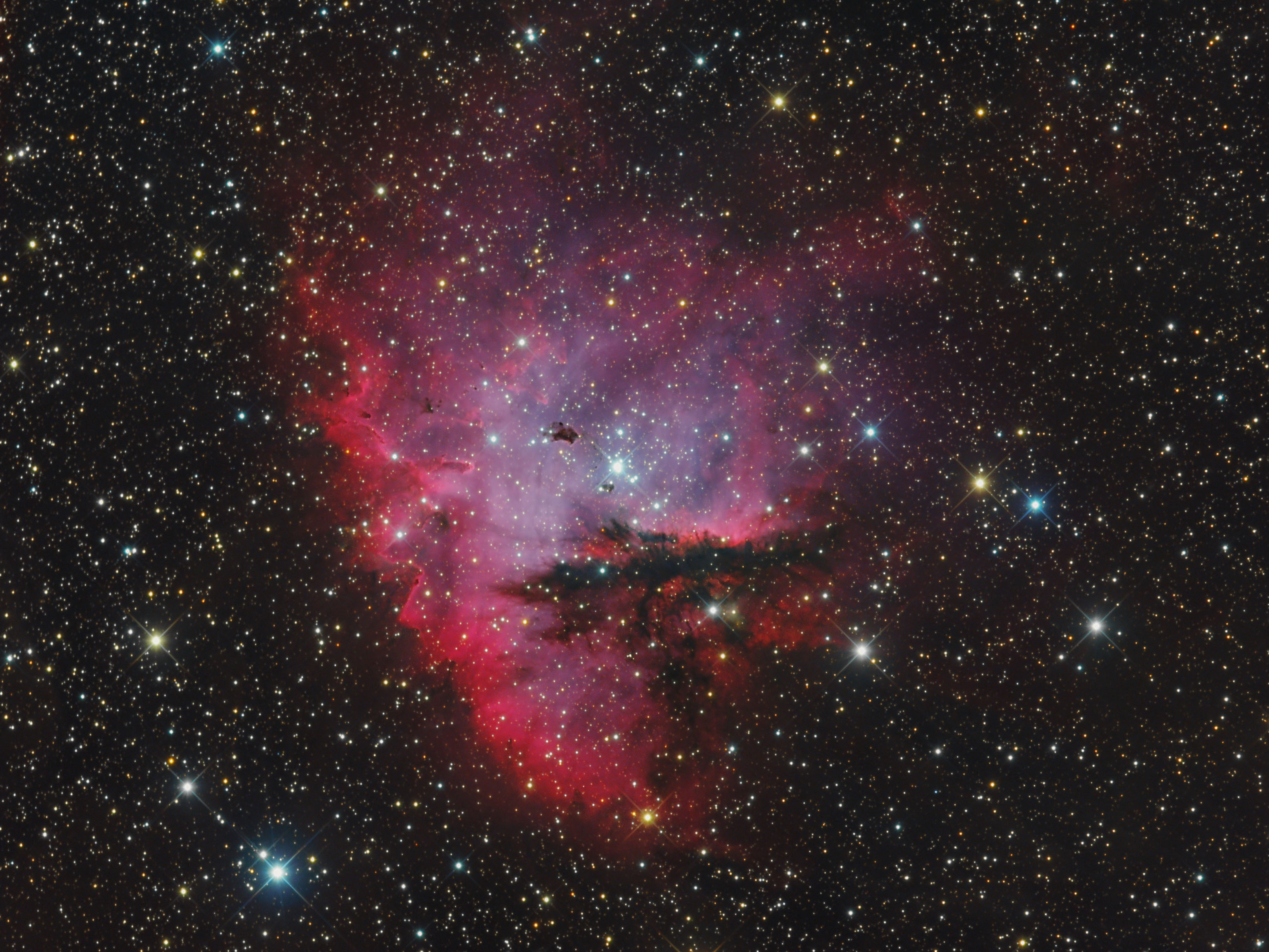 NGC 281 ist ein Emissionsnebel im Sternbild Kassiopeia, etwa 9500 Lichtjahre entfernt. Vor allem im englischen Sprachraum wird er auch als Pac-Man-Nebel bezeichnet. Um das Zentrum des Nebels sind die Sterne des offenen Sternhaufens IC 1950 verstreut, wobei dessen hellstes Mitglied, das Mehrfachsternsystem HD 5005, die ionisierende Quelle des Nebels darstellt. Der Nebel enthält auch mehrere Bok-Globulen. Bei 1080 mm Brennweite reicht das Feld mit 57 x 43 Bogenminuten gerade noch für den Pacman-Nebel aus.