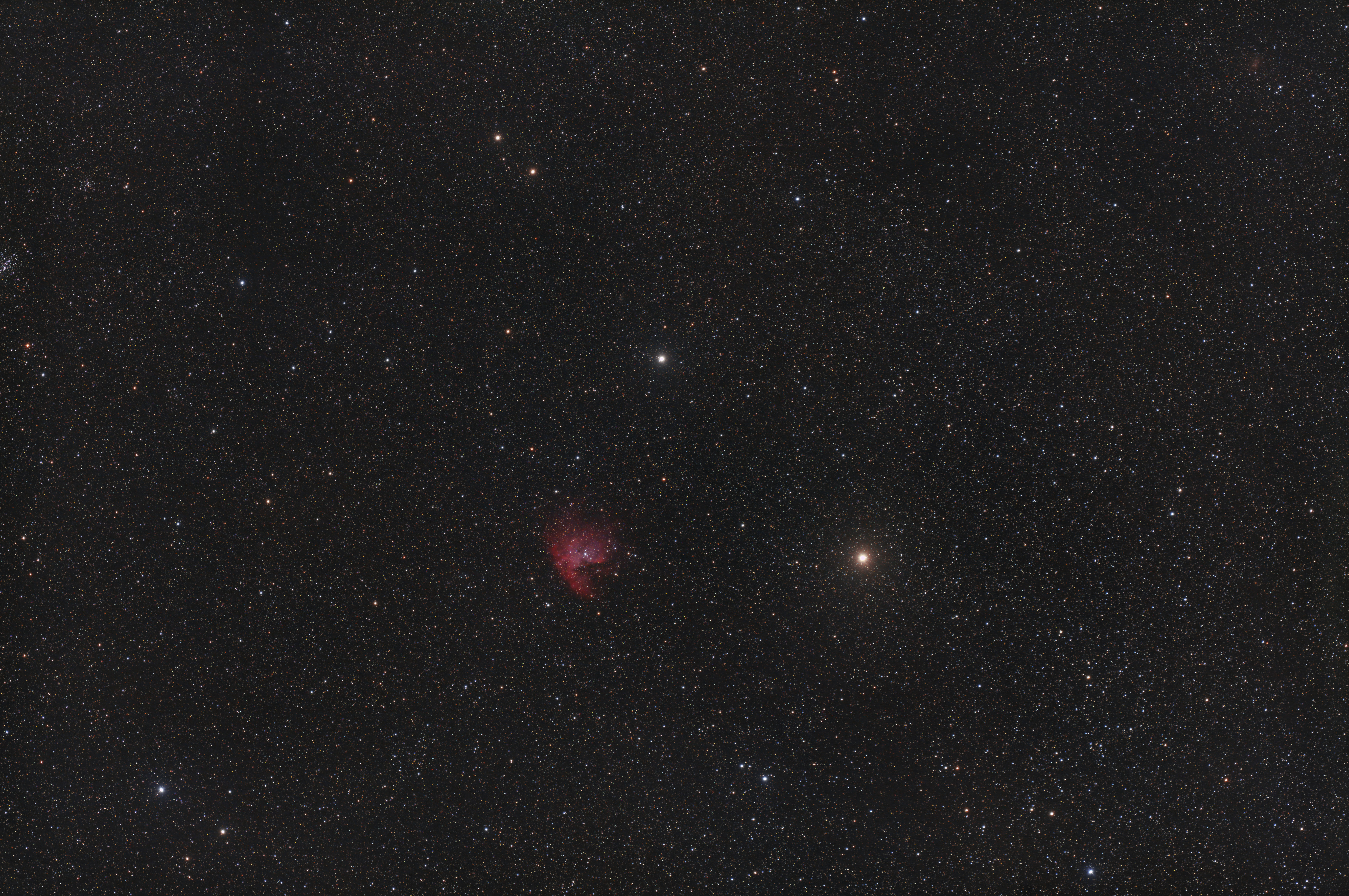 Wenn man NGC 281 mit einer Brennweite von 250 mm mit einer Vollformatkamera aufnimmt, wirkt der Emissionsnebel eher verloren im 8,3 x 5,5 Grad großen Feld. Gesamtbelichtungszeit 268 min bei ISO 1600.
