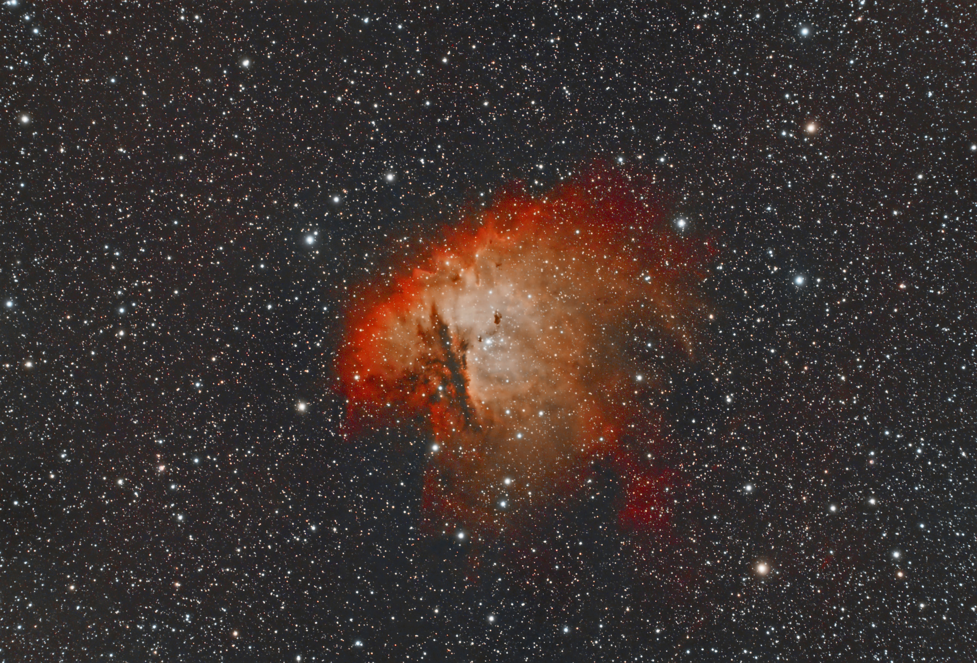 NGC 281, Pacman Nebel, gestackt aus 210 Bildern, Belichtungszeit 19h 30m. NGC 281 ist ein Emissionsnebel im Sternbild Kassiopeia am Nordsternhimmel, der 9500 Lichtjahre von der Erde entfernt ist. Der Nebel ist im Index-Katalog als IC 11 erfasst und wird umgangssprachlich wegen seiner Ähnlichkeit mit der bekannten gleichnamigen Videospiel-Hauptfigur vor allem im englischen Sprachraum auch als Pac-Man-Nebel bezeichnet. In NGC 281 ist der offene Sternhaufen IC 1590 eingebettet, dessen Sterne um das Zentrum des Nebels verstreut sind und von denen einige durch ihre Röntgenstrahlung hervortreten. Das hellste Mitglied von IC 1590, das Mehrfachsternsystem BD +55° 191 (HD 5005), ist die ionisierende Quelle des Nebels. Der Nebel enthält auch mehrere Bok-Globulen, in denen durch Infrarotaufnahmen Anzeichen für Sternentstehung festgestellt werden konnten. Ebenfalls in Infrarotaufnahmen ist die Molekülwolke erkennbar, deren ionisierter Teil der Emissionsnebel ist.