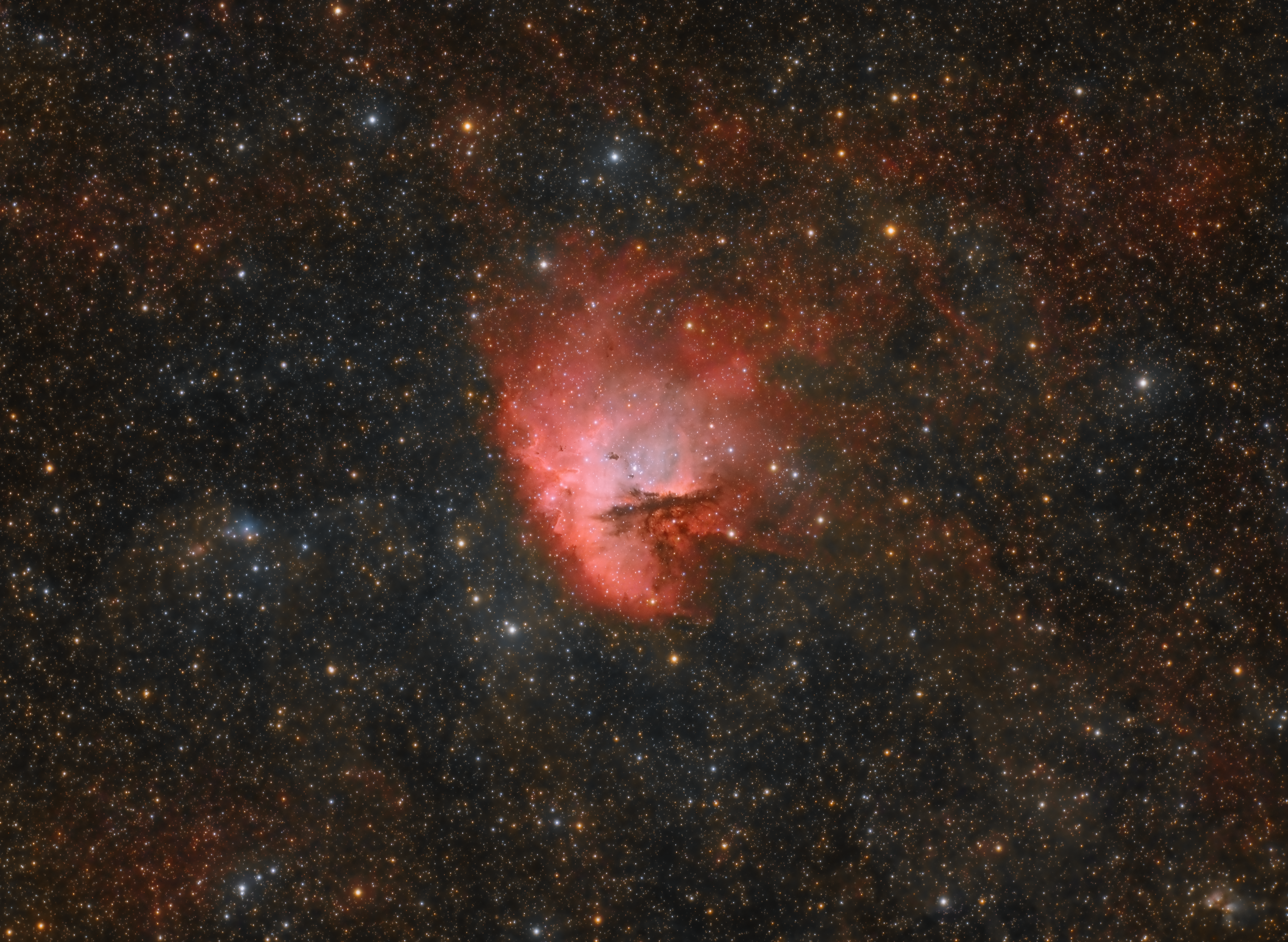 Hallo Sternfreunde, das Sternbild Kassiopeia steht zu dieser Jahreszeit hoch am Sternhimmel. Zwischen den Sternen Navi und Shedar findet man den bekannten Pac-Man-Nebel NGC 281. Im Herbst 2020 ist mir diese Aufnahme gelungen. Mein Ziel war es das Umfeld vom Emissionsnebel einzufangen. Erkennbar ist das NGC 281 umgeben ist von Staub und Ha Bereichen. Das Bild wurde im H-Alpha-LRGB Verfahren kombiniert. Viel Spaß beim Anschauen.