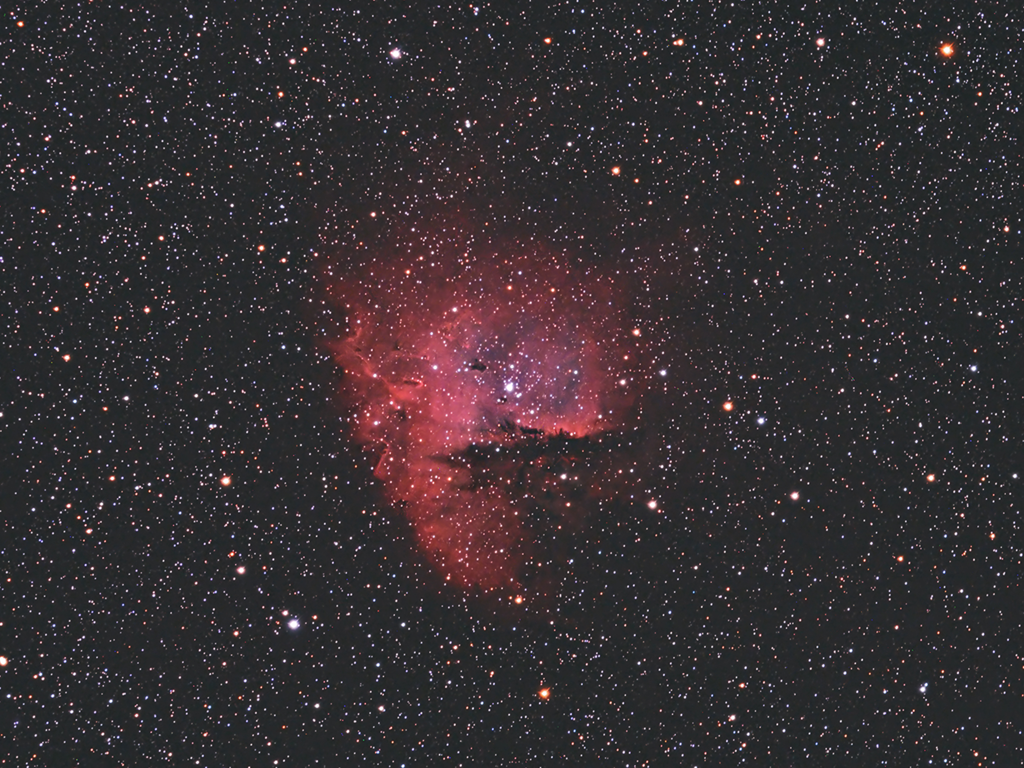 Der auch Pacman genannte Emmisionsnebel NGC 281 in der Cassiopeia enthält neben dem aus ihm entstandenen Sternhaufen IC 1590 auch mehrere Bok-Globulen. Das macht ihn zu einem wunderschön strukturierten Objekt.