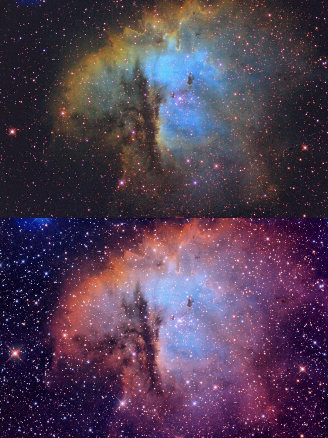 NGC 281 mal als Narrowband und als Kombination mit LRGB aus einer älteren Aufnahme. Insgesamt 20 h Belichtungszeit.