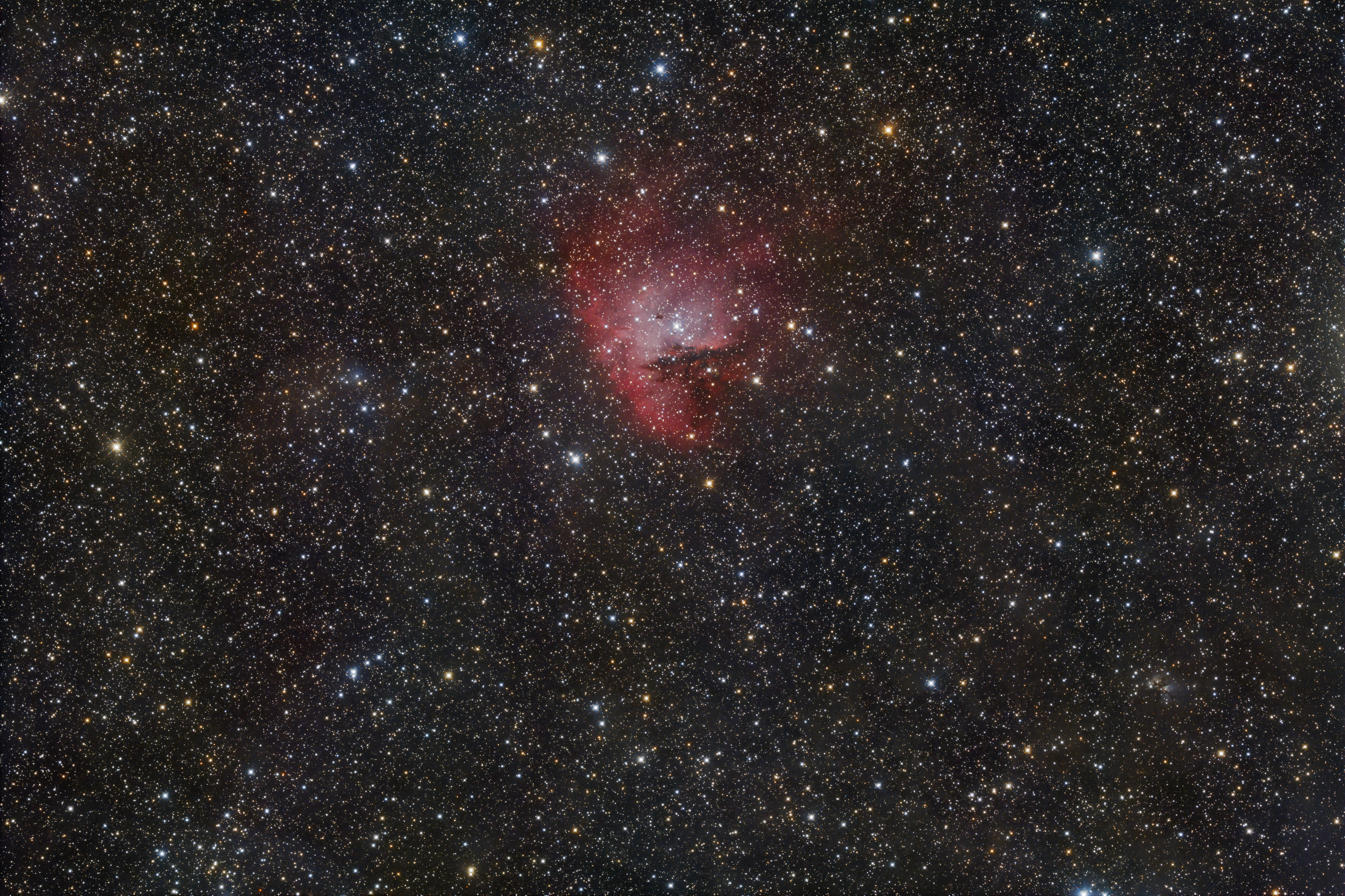 Den Emissionsnebel NGC 281 im Sternbild Kassiopeia, etwa 9500 Lichtjahre von der Erde entfernt, habe ich schon mehrmals mit verschiedenen Brennweiten aufgenommen. Der Nebel wird wegen seiner Ähnlichkeit mit der bekannten gleichnamigen Videospiel-Hauptfigur vor allem im englischen Sprachraum auch als Pac-Man-Nebel bezeichnet. In NGC 281 ist der offene Sternhaufen IC 1590 eingebettet, dessen Sterne um das Zentrum des Nebels verstreut sind und von denen einige durch ihre Röntgenstrahlung hervortreten.