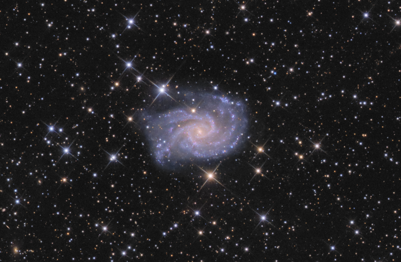 Hallo, die zarte SBc-Galaxie NGC2835 in der südlichen Hydra kommt neben den Highlights in der Region wie M83 meist zu kurz, aber mit 10,3 mag und 6,6 x 4,4 Bogenminuten ist sie beachtlich. Besonders, wenn man auf der Suche nach neuen Objekten ist ;-) Ich hatte 2019 Faried auf Rooisand belästigt und dabei ist die Aufnahme am 10" f/4 entstanden: Das volle Feld: https://data.tommynawratil.com/Astro/Pics/NGC2997_10Nf4_ASI294_2x2_LRGB_cr.jpg; Daten und Details auf Astrobin: https://www.astrobin.com/n28ca1/ lg Tommy
