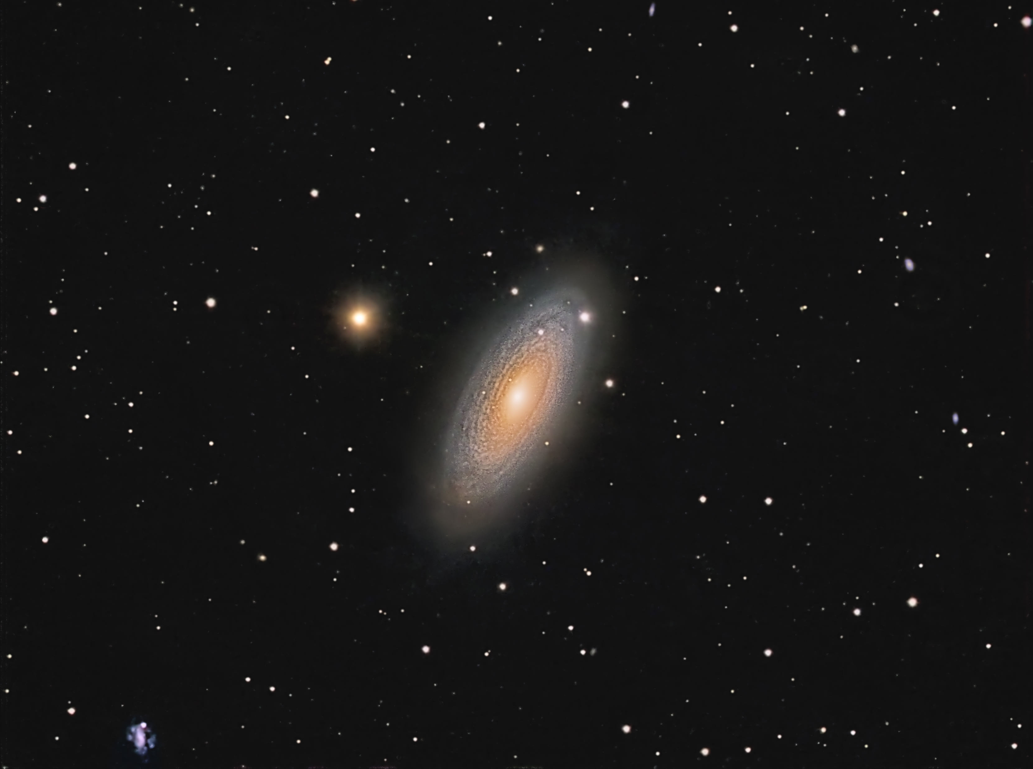 NGC 2841 wird auch als Tigeraugen-Galaxie bezeichnet und befindet sich im Sternbild Großer Bär. Sie stand bei uns in Norddeutschland zu Beginn der Aufnahme mit 88 Grad Höhe fast im Zenit.