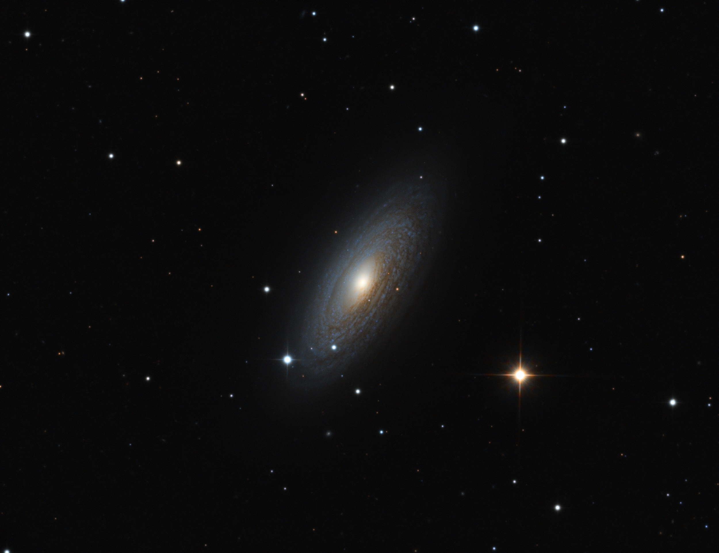 NGC 2841 ist eine Galaxie im Sternbild Großer Bär (Ursa Major) und ist rund 45 Millionen Lichtjahre entfernt. Das Auffälligste an dieser wunderschönen Galaxie ist die Spiralarmstruktur. Diese Galaxie weist eher kurze Spiralarme auf, daher der Name "Flockungsspirale". Sie hat auch ein sehr dynamisches Farbspiel zwischen Gelb und Blau, was der Galaxie zusätzlichen Reiz verleiht.