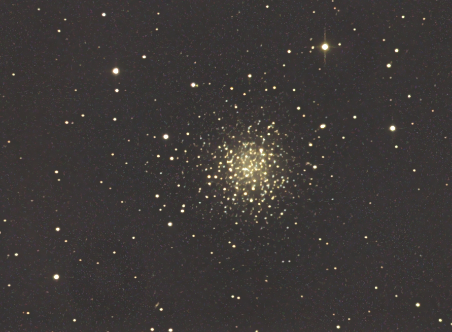 Bei schlechten Wetterbedingungen (Südföhnlage, Wind, schwieriges Fokussieren) habe ich diesen Kugelhaufen (8,1 mag, Entfernung 30000 Lj) mit meinem 6"-f/5-Newton bei ausschließlich 2x2 Binning 2h lang belichtet. Er liegt 2 Grad südöstlich der Sculptor-Galaxie NGC 253 bei -26,5 Grad Deklination!
