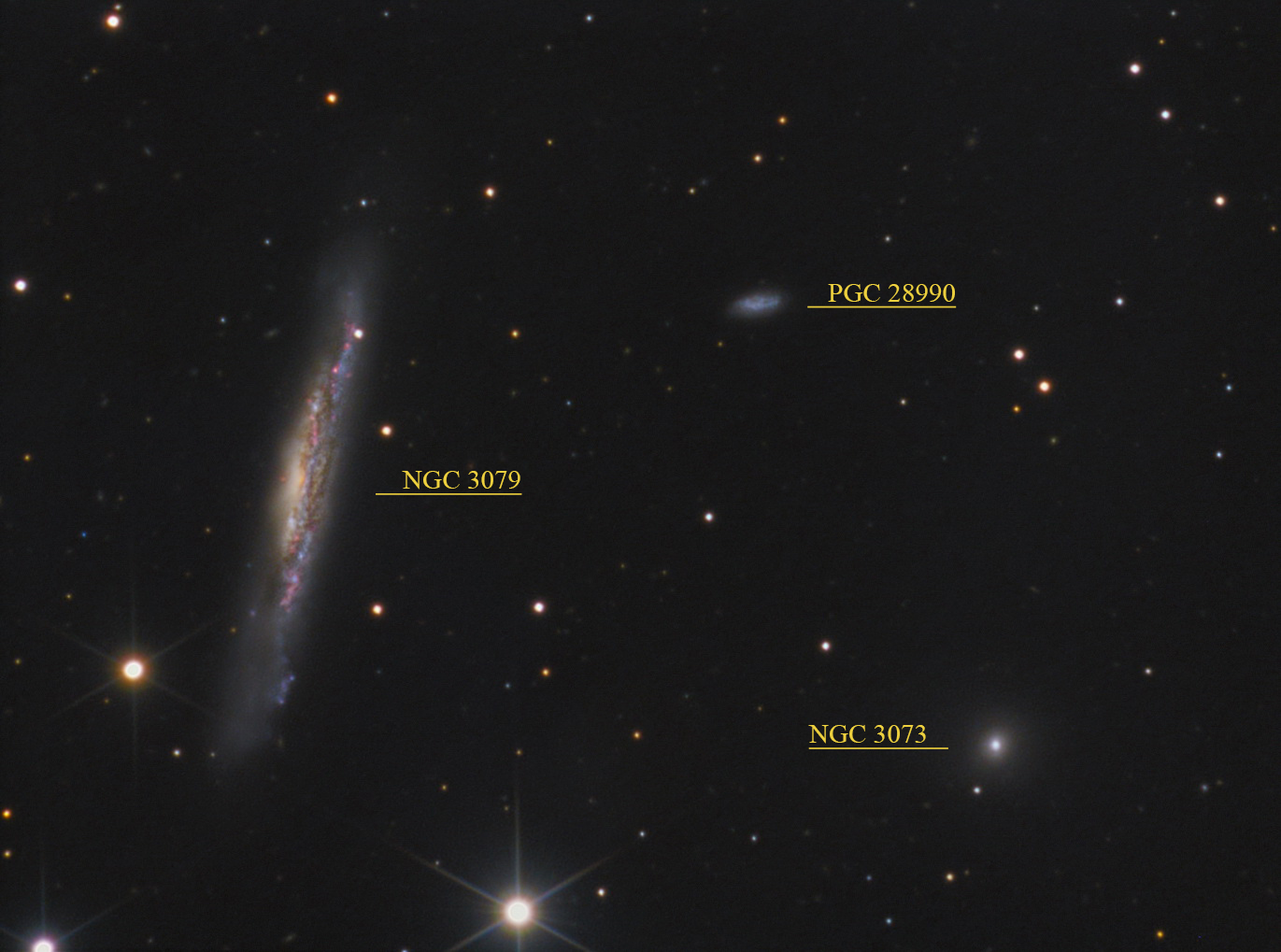 NGC 3079 ist eine Balken-Spiralgalaxie mit aktivem Galaxienkern, zählt also zu den Seyfert Galaxien. Sie ist etwa 53 Millionen Lichtjahre entfernt und hat einen Durchmesser von 120.000 Lichtjahren. NGC 3073 ist eine elliptische Zwerggalaxie mit aktivem Kern und etwa 20 Millionen Lichtjahre entfernt.