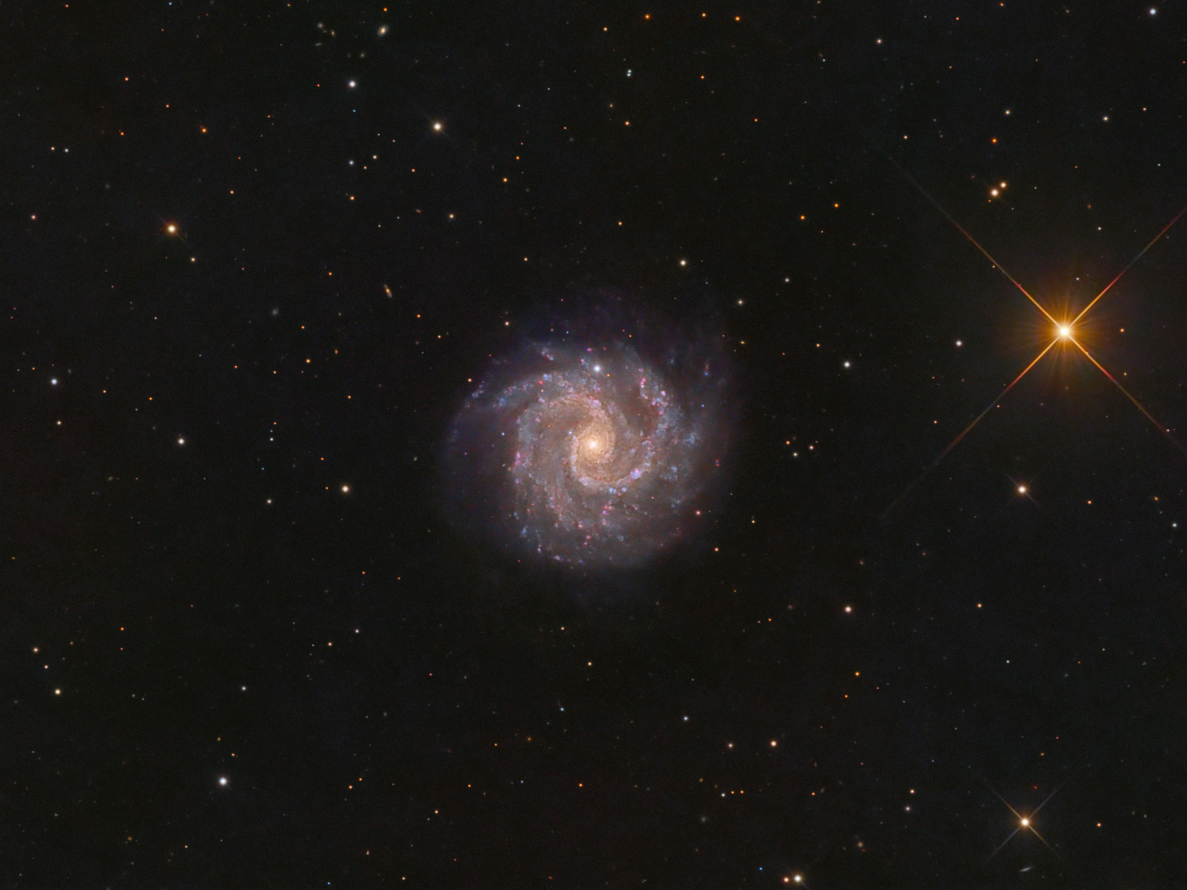 Zum Start der Galaxiensaison habe ich mir für dieses Jahr die Balkenspiralgalaxie NGC 3184 ausgewählt. Sie wird auch als kleine Feuerradgalaxie bezeichnet und hat eine gewisse Ähnlichkeit mit ihrem großen Verwandten M 101. NGC 3184 steht im Sternbild Großer Bär in ca. 27 Millionen Lichtjahren Entfernung. Sie hat sehr schöne ausgeprägte Spiralarme, deren Verlauf man fast bis in den Kern hinein verfolgen kann. Diese enthalten etliche winzige H-alpha-Knötchen und es lohnt sich unter Umständen weitere Belichtungszeit in zusätzliche Schmalbandaufnahmen zu investieren. Leider stiehlt ihr der 6,5 mag helle Stern GR UMa etwas die Show und lenkt das Auge bei der Betrachtung des Bildes weg von der Galaxie. Dennoch war diese schöne "Face-on-galaxy" für mich ein würdiger Einstieg in die diesjährige Galaxiensaison.