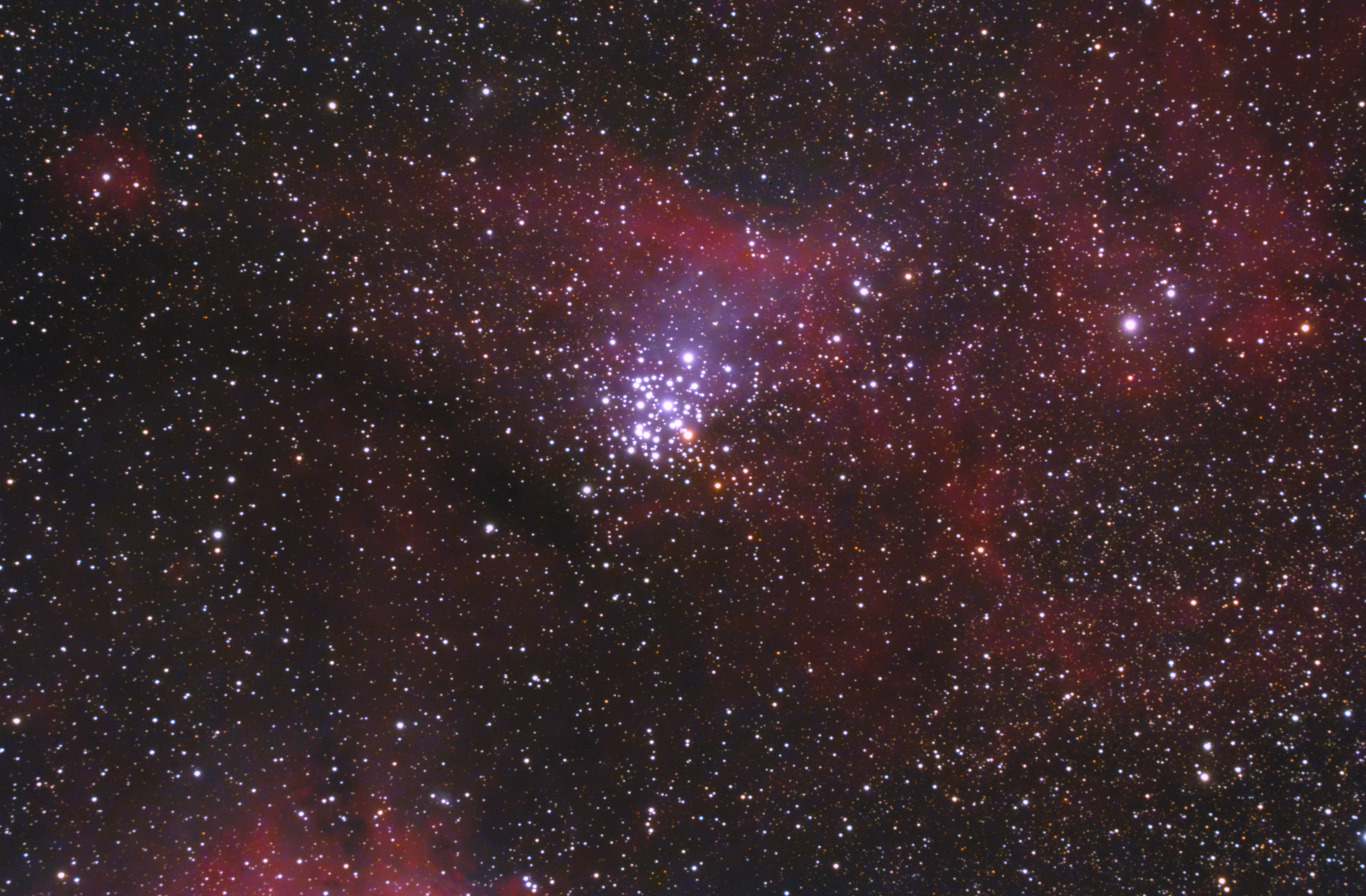 NGC 3293 bietet neben dem Kontrast des einen Roten Riesen zum Rest der Haufensterne auch einen schönen Farbkontrast zwischen blauen Reflexions- und roten Emissionsnebeln.