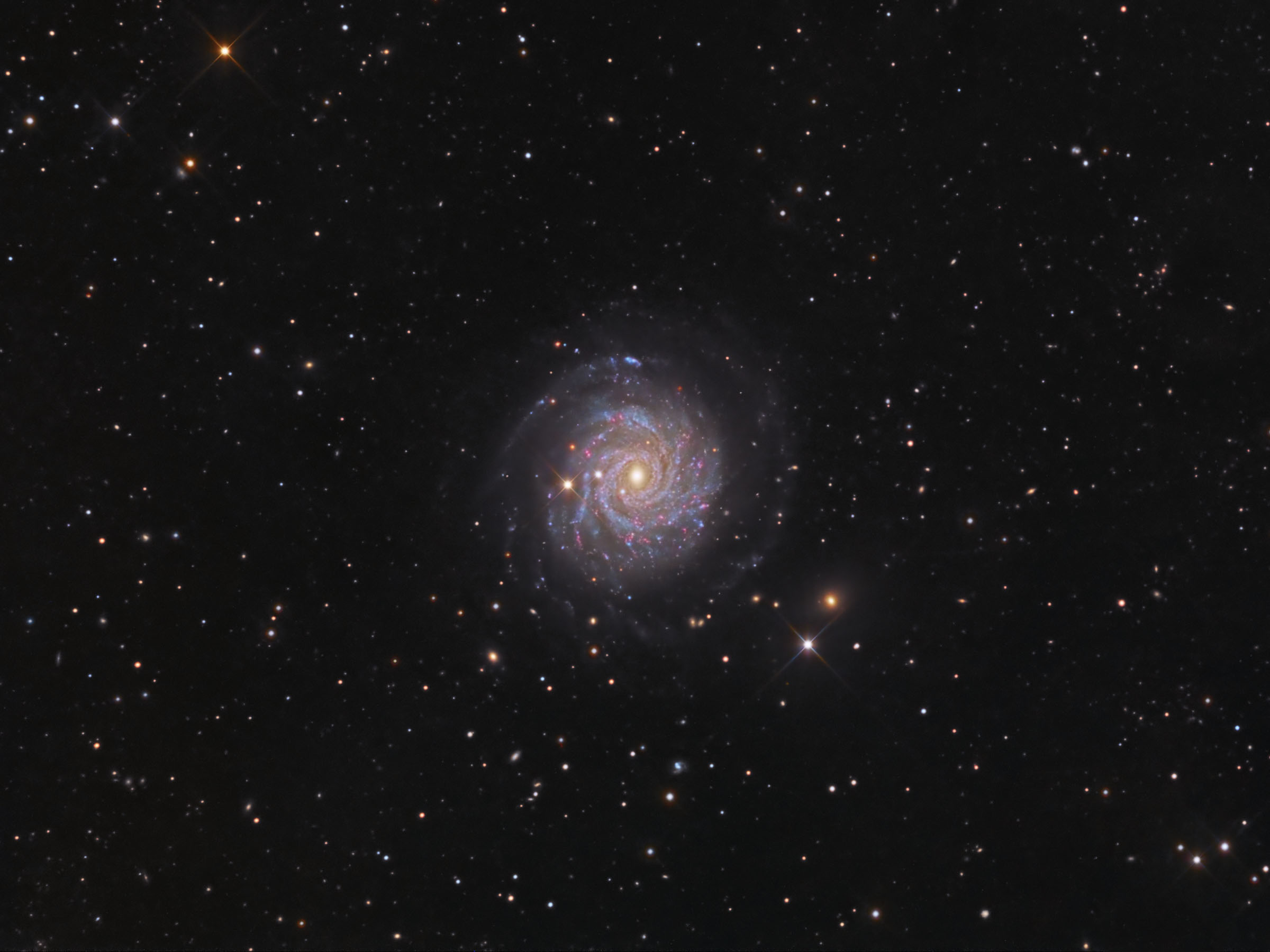 NGC 3344 ist eine Balkenspirale im Sternbild Kleiner Löwe in etwa 24 Millionen Lichtjahren Entfernung und mit nur 40000 Lichtjahren Durchmesser deutlich kleiner als unsere Milchstraße. Sie beinhaltet eine Vielzahl ausgedehnter Sternentstehungsgebiete, welche bereits in dieser LRGB-Aufnahme deutlich hervortreten. Nach meiner Einschätzung würden in diesem Fall zusätzliche H-Alpha-Schmalbandaufnahmen keinen deutlichen Zugewinn an Information bringen. Wir schauen aus unserer Perspektive genau auf die Ebene der Galaxie und können so die Spiralarme in ihrer vollen Schönheit betrachten. Ich war schon immer angetan von diesem Himmelsobjekt und so stand diese Galaxie ganz oben auf meiner Liste.