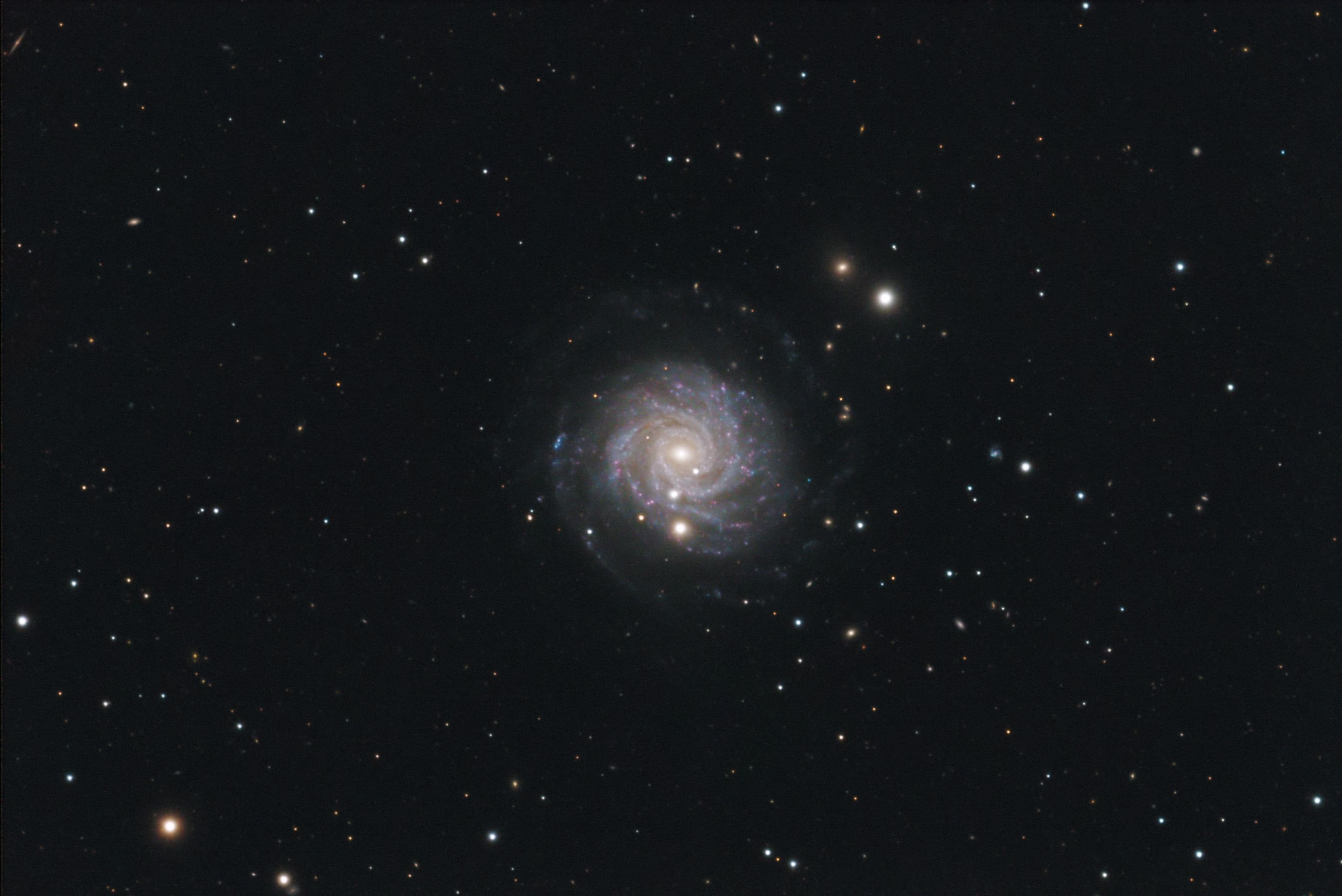Diese wunderschöne Face-on-Spirale im Löwen verdient sicherlich mehr Beachtung. Dieses Jahr nahm ich mir vor, sie mit höherer Auflösung abzulichten. So entstand die anliegende Aufnahme mit dem C11 EdgeHD bei f/10 und einem Abbildungsmaßstab von 0,55 Bogensekunden pro Pixel. Das Seeing war für meinen Standort durchschnittlich, erlaubte aber, die vielen HII-Regionen und Sternassoziationen in den Spiralarmen aufzulösen.