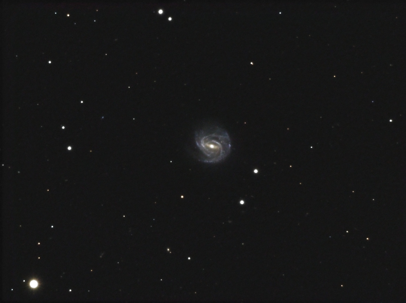 In einer Übersichtsaufnahme des Feldes um M 95 fiel mir die kleine (gut 2 Bogenminuten) Galaxie NGC 3367 durch ihre schöne Spiralform und die relativ hohe Flächenhelligkeit auf. Trotz Berliner Großstadtlichter (meine Dachterrasse liegt in der Berliner Innenstadt) mit einer Himmelshelligkeit im Aufnahmegebiet von ca. 18,5 mag (gemessen mit dem SQM-L) war die Galaxie hell genug für einen Aufnahmeversuch.