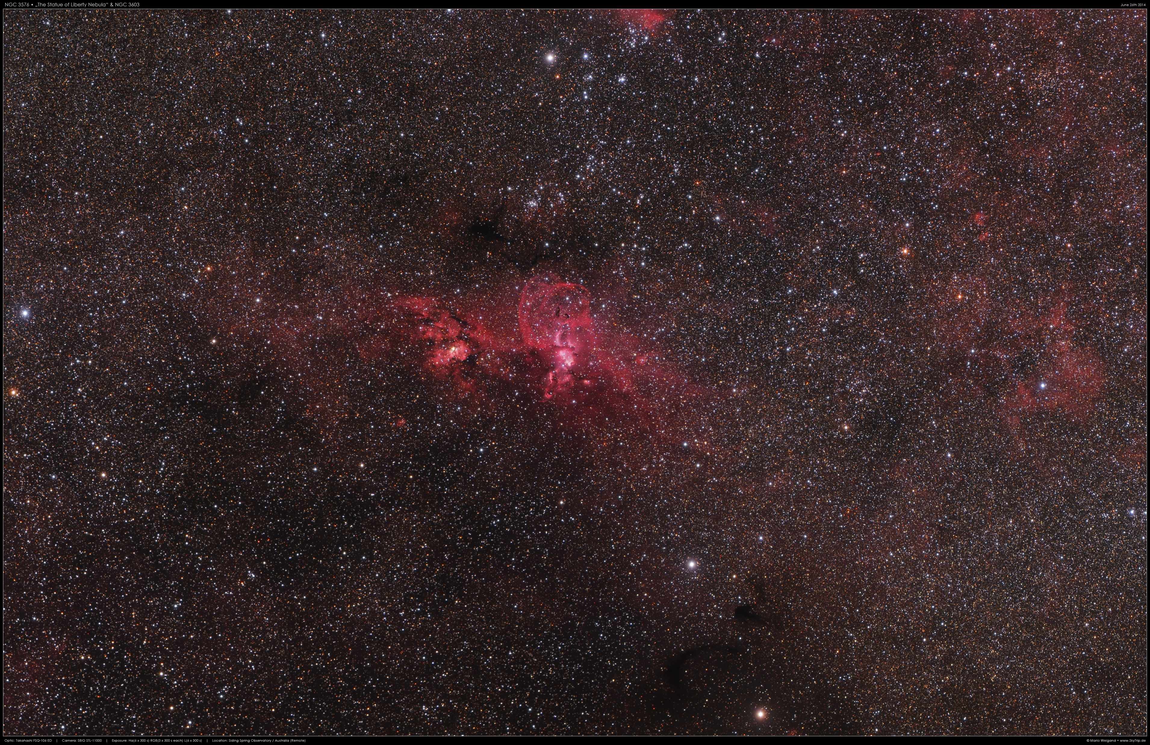 Eine der vielen spannenden Regionen des Südhimmels: Im Südwesten des Sternbildes Carina findet man nicht nur den fantastischen Carinanebel, sondern auch weitere interessante Nebel! Dazu gehört devinitiv das NGC 3576 und der Sternhaufen NGC 3603, der ebenfalls von Emissionsnebeln umgeben ist. NGC 3576 trägt auch den Spitznamen "The Statue of Liberty Nebula", denn die Staubsäulen im Zentralbereich erinnern verblüffend an die Freiheitsstatue in New York. Auffällig sind außerdem bogenförmige Strukturen, die sehr an Bogenprotuberanzen erinnern, die man manchmal am Sonnenrand beobachten kann.