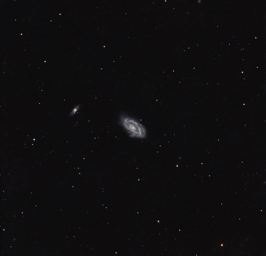 NGC 3646 ist eine sehr eigentümliche Spiralgalaxie im Löwen. Ihre innere Spiralstruktur entspricht der einer normalen, flockigen Spirale, die äußere jedoch bestenfalls chaotisch. Eine Anmerkung bei NED lautet: »… Das Spiralmuster ist sehr ungewöhnlich. Sie könnte ein Beispiel für eine Galaxie mit sichtbaren Vorder- und Hinterarmen sein.« Eine weitere Anmerkung vertritt eine etwas andere Ansicht: „Die Morphologie von NGC 3646 ist eigenartig, wie das Ergebnis einer Begegnung. Das äußere Spiralmuster lässt sich nicht einmal hinsichtlich der Richtung zurückverfolgen, das innere Spiralmuster ist jedoch regelmäßig. NGC 3646 bildet ein physikalisches Paar mit NGC 3649 (SBa; nicht im RSA) in einem Winkelabstand von 8 Bogenminuten. Die Rotverschiebungen aus dem Katalog von Karachentsev (1987) betragen v_o(3646) = 4227 km/s und v_o(3649) = 4322 km/s. Bei einer mittleren Rotverschiebungsdistanz von 85 Mpc (H = 50) beträgt der projizierte lineare Abstand 200 kpc. Es gibt jedoch keine Hinweise auf eine morphologische Verzerrung im Spiralmuster von NGC 3649. Die eigentümliche äußere Ringstruktur in NGC 3646 kann hier nicht auf eine Wechselwirkung mit NGC 3649 zurückgeführt werden.“ Der Winkeldurchmesser ist deutlich kleiner als bei NGC 3646. Die Durchmesser betragen 80" für NGC 3649 und 260" für den äußeren Ring von NGC 3646. Der innere Teil von NGC 3646 ähnelt einer normalen Sbc-Spirale der gleichen Größe wie NGC 3649. Der lineare Durchmesser dieses inneren Teils beträgt 33 kpc – ein normaler Wert für die meisten RSA-Spiralen. Der äußere Ring von NGC 3646 hat jedoch einen linearen Durchmesser von 107 kpc, was ungewöhnlich groß ist. Die Tatsache, dass das innere Bild von NGC 3646 eine normale Morphologie und Größe aufweist, deutet darauf hin, dass der Ring das Ergebnis eines dynamischen Prozesses ist, beispielsweise des Hineinfallens einer Galaxie in eine andere, wie es Theys und Spiegel (1976, 1977) sowie Lynds und Toomre (1976) für andere Ringgalaxien postulierten. Das abnormale Geschwindigkeitsfeld und ein früher Hinweis auf den großen linearen Durchmesser des Rings stammen von Burbidge, Burbidge und Prendergast (1961). HSB = Hohe Oberflächenhelligkeit, LSB = Niedrige Oberflächenhelligkeit, RSA = Überarbeitung des Shapley-Ames-Katalogs heller Galaxien. Ein Parsec entspricht 3,26 Lichtjahren, sodass ein Durchmesser von 107 kpc fast 350.000 Lichtjahren entspricht. Der Artikel verortet ihn jedoch weiter entfernt als heutige Schätzungen. Mit 210 Millionen Lichtjahren beträgt der Durchmesser etwa 265.000 Lichtjahre und ist damit immer noch sehr groß. NGC 3646 wurde am 15. Februar 1784 von William Herschel entdeckt. Sie ist Teil des zweiten H400-Programms. NGC 3649, obwohl als Begleiter bezeichnet, weist eine etwas andere Rotverschiebung auf und erscheint eher normal. Sie interagiert nicht mit NGC 3646 und scheint dies auch in der Vergangenheit nicht getan zu haben. Die Rotverschiebung gibt eine Entfernung von 240 Millionen Lichtjahren an, während NGC 3646 eine Rotverschiebungsdistanz von 210 Millionen Lichtjahren aufweist. Tully-Fisher-Entfernungsschätzungen gehen von 174 bis 203 Millionen Lichtjahren Entfernung aus, wobei modernere Messungen die kürzere Distanz favorisieren. Das Paar befindet sich im Sternbild Löwe. NED stuft NGC 3646 als SA:(r)bc pec (Ring) ein. Das NGC-Projekt verwendet die einfachere Klassifizierung Sc I. NGC 3649 wurde von William Herschel in derselben Februarnacht wie NGC 3646 entdeckt. Sie ist in keinem der beiden H400-Programme enthalten.