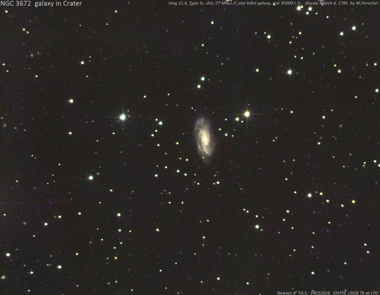 Nur ein Grad nördlich des 4,8 mag schwachen Sterns Eps Crt liegt diese vernachlässigte Galaxie mit ihrer großen Achse (3,9 x 1,9 Bogenminuten) genau in N-S-Richtung. Es handelt sich um eine Galaxie mit 10,4 mag vom Hubble-Typ Sc und sie zeigt ausgedehnte Sternentstehungsgebiete (Starburst-Regions). Ihre Entfernung beträgt etwa 78 Millionen Lichtjahre und ihre Ausdehnung ist mit 95000 Lichtjahren ähnlich unserer Milchstraße. Zwei Supernovae wurden hier bereits entdeckt, 2007 und 2008. Entdeckt wurde sie am 4.März 1786 von W. Herschel also fast genau vor 237 Jahren.