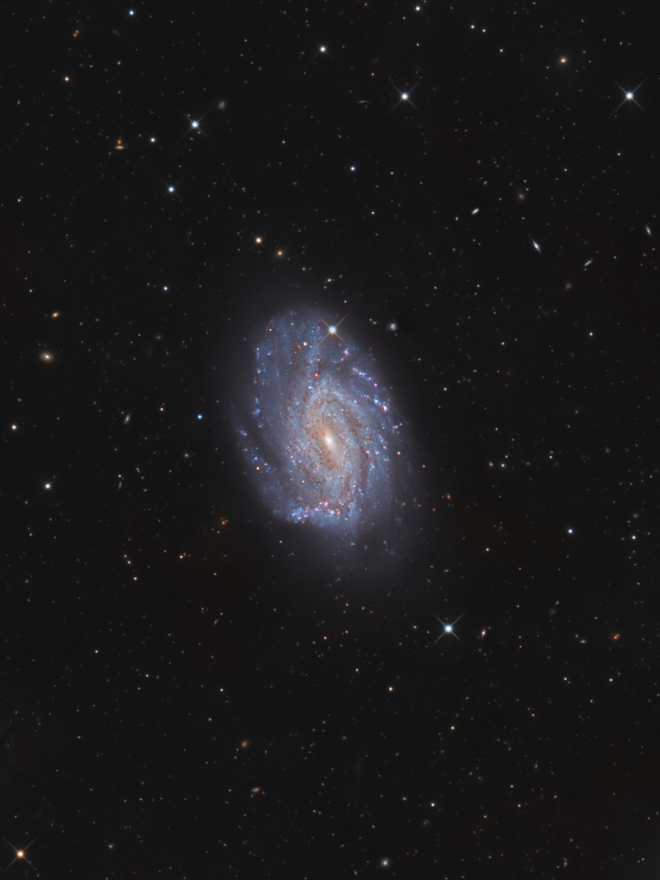 Die Balkenspiralgalaxie NGC 3726 befindet sich in einer Entfernung von 41 Millionen Lichtjahren im Sternbild Großer Bär, ihre Ausdehnung beträgt etwa 70000 Lichtjahre. In ihren Spiralarmen gibt es zahlreiche HII-Regionen, die zum Teil in der hier gezeigten LRGB-Aufnahme schon recht gut zu erkennen sind. Die Nächte gegen Ende des Monats April waren schon sehr kurz und so habe ich in diesem Fall nur knapp fünf Stunden Belichtungszeit für dieses Target angesetzt. Eigentlich keine große Einschränkung, da die Galaxie recht hell ist, doch die geringe Anzahl von Einzelframes, speziell mit den RGB-Filtern, erschwerte die Beseitigung der Satellitenspuren beim Stacken. Obwohl das Bildfeld mit dem APS-C-Sensor bei über 2m Brennweite schon recht klein ist, hatte ich dennoch eine beachtliche Anzahl von Spuren in den Frames.