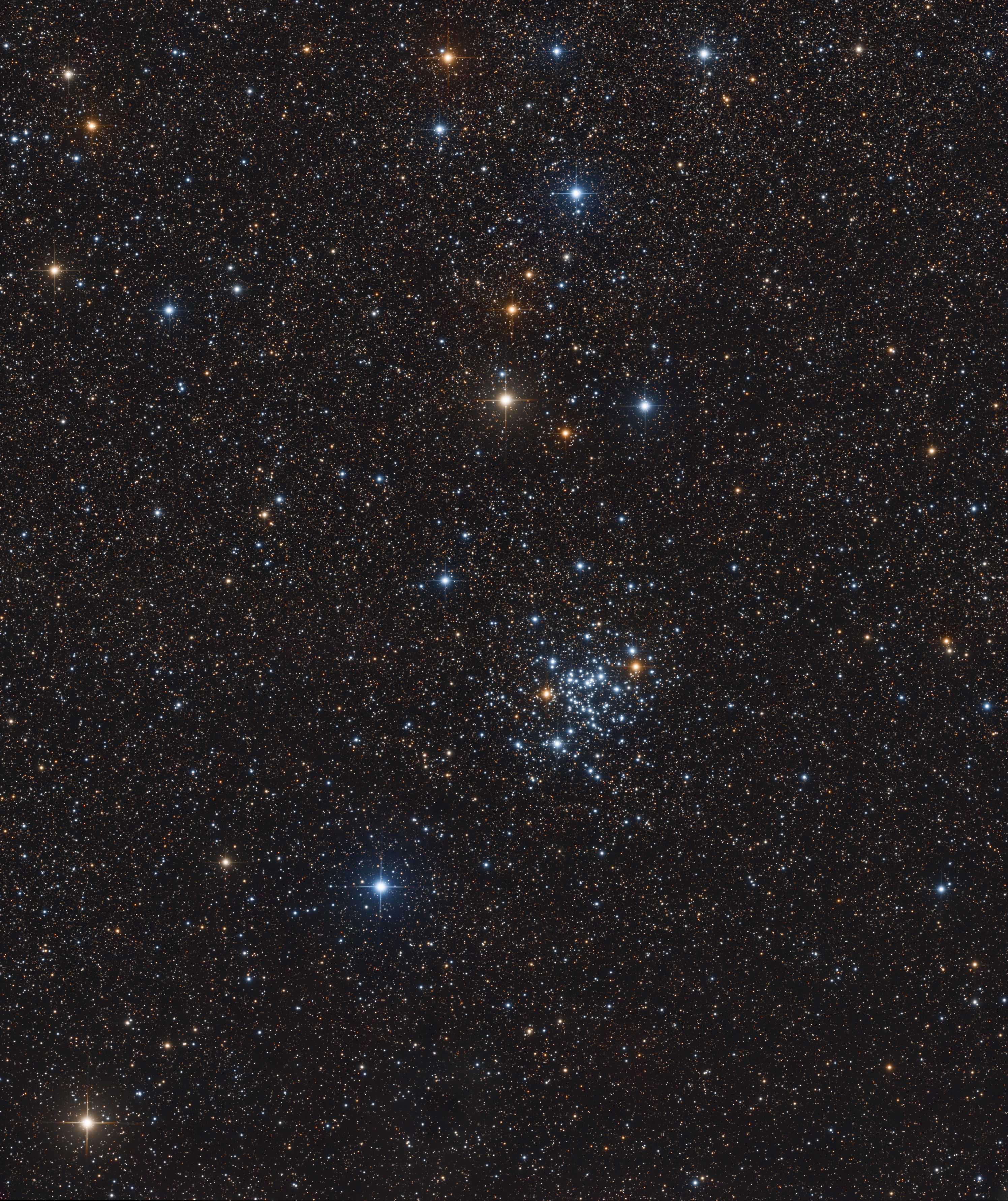 Diese Weitfeldaufnahme (2-fach-Mosaik) zeigt den offenen Sternhaufen NGC 3766, der scheinbar schwerelos im Universum schwebt. Es ist ein helles Objekt am Südhimmel, das schon mit bloßem Auge zu sehen ist und in einem mittelgroßen Amateurteleskop sehr beeindruckend wirkt. Es glitzert wie in einer Schatulle voll mit Juwelen. Aufgenommen in Namibia, IAS Hakos Remote Observatory; Remote Team Lukas