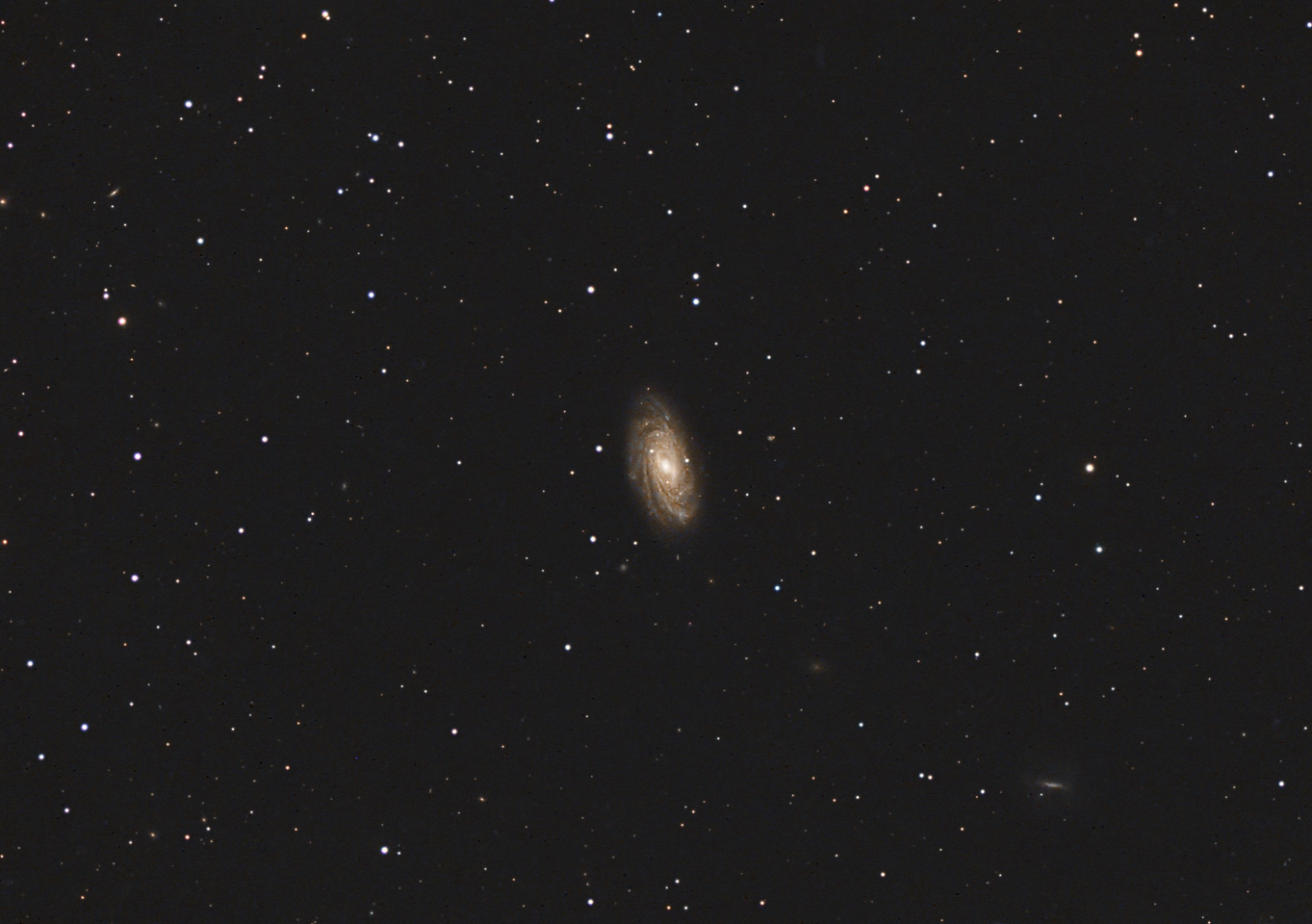 NGC 3953 und UGC 06840 sind ein Galaxienpaar mit der gleichen Rotverschiebung, das heißt sie sind etwa 55 bis 60 Millionen Lichtjahre entfernt. Sie befinden sich in Ursa Major etwa 1,3 Grad südlich von Phecda, dem südöstlichen Stern in der Schale des »Großen Wagens«. NGC 3953 ist eine schöne mehrarmige, etwas flockige Balkenspirale mit einer sehr seltsamen Armstruktur auf der östlichen (linken) Seite. Zwei Arme scheinen sich plötzlich zu vereinigen. UGC 06840 in der südwestlichen Ecke meines Bildes hat fast genau die gleiche Rotverschiebung, ist aber eine ganz andere Galaxie. Sie hat eine sehr geringe Oberflächenhelligkeit, mit Ausnahme des Balkens, der dazu führt, dass sie als Balkenspirale vom Magellan-Typ eingestuft wird. Die beiden Galaxien bilden einen schönen Kontrast. NGC 3953 wurde am 12. März 1781 von Pierre Mechain entdeckt. Bis 2006 wurde diese Entdeckung fälschlicherweise auf NGC 3992 übertragen. Bis dahin wurde die Entdeckung William Herschel acht Jahre später, am 12. April 1789, zugeschrieben.