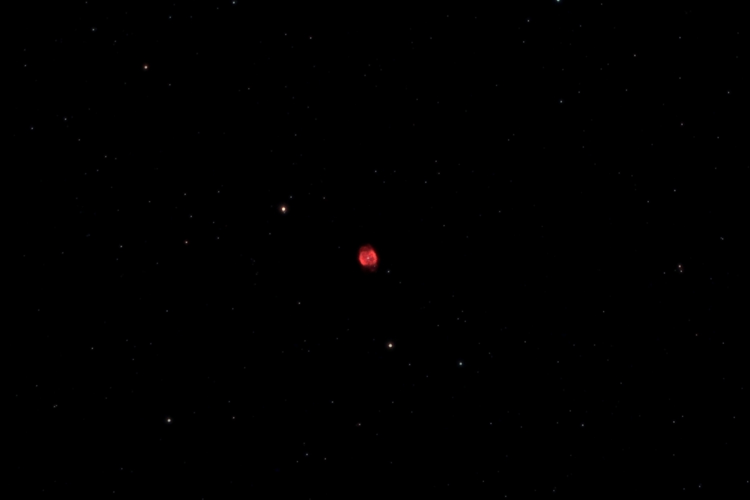 Kleiner aber heller planetarischer Nebel. Ich habe ihn deshalb 10 mal 30 Sekunden ohne Nachführkorrektur aufgenommen und die Rohbilder in DSS mit 2 x Drizzle aufsummiert (bei ISO 1600 ohne Dunkelbildabzug!)