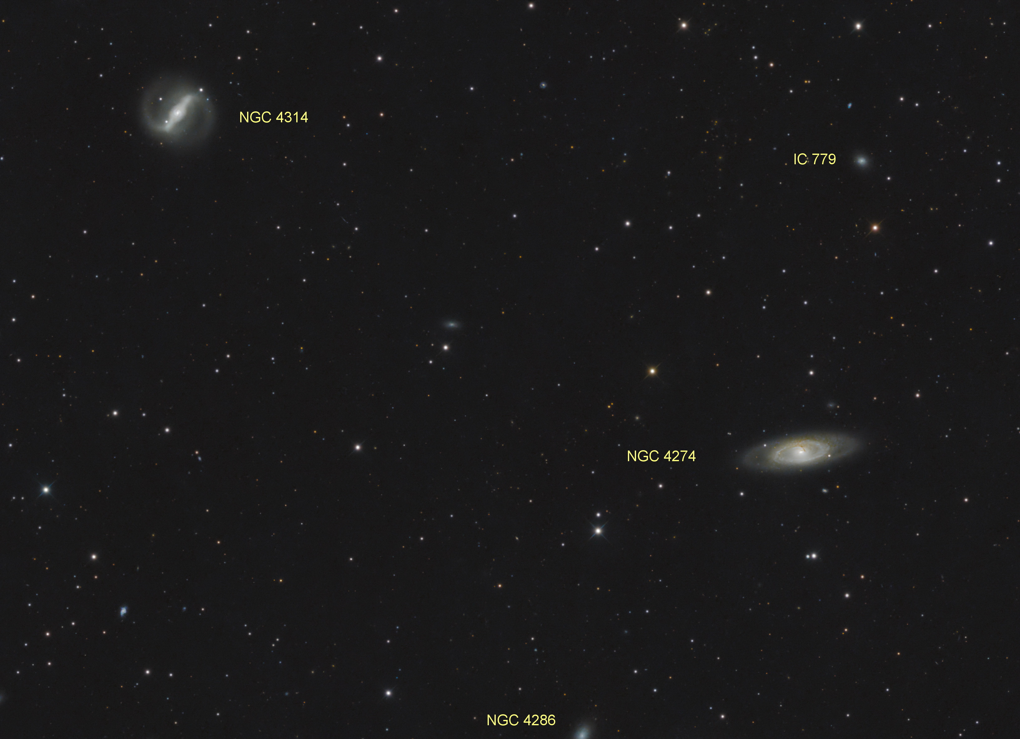 Bei so vielen Galaxien ist man als Astrofotograf dankbar, wenn sich gleich zwei sehr unterschiedliche in einem Bildfeld ausgehen. So auch hier bei NGC 4314 und NGC 4274 im Sternbild Haar der Berenike. NGC 4314 ist eine Balken-Spiralgalaxie, schätzungsweise 43 Millionen Lichtjahre von der Milchstraße entfernt und mit einem Durchmesser von etwa 55000 Lichtjahren. Gemeinsam mit 18 weiteren Galaxien bildet sie die NGC 4274-Gruppe (LGG 279). NGC 4274 ist eine Balken-Spiralgalaxie mit aktivem Galaxienkern. Sie ist schätzungsweise 41 Millionen Lichtjahre von der Milchstraße entfernt und hat einen Durchmesser von etwa 85000 Lichtjahren. Sie ist die hellste Galaxie der NGC 4274-Gruppe (LGG 279) und gilt als Mitglied des Coma-Galaxienhaufens. IC 779 ist eine elliptische Zwerggalaxie vom Hubble-Typ dE. Sie ist schätzungsweise 10 Millionen Lichtjahre von der Milchstraße entfernt und hat einen Durchmesser von etwa 2000 Lichtjahren. Die Entfernungsmessungen basierend auf den Radialgeschwindigkeiten stimmen nicht mit den rotverschiebungsunabhängigen Entfernungsschätzungen von 54 ± 9 Millionen Lichtjahren überein. Gemeinsam mit dreizehn weiteren Galaxien bildet sie die NGC 4631-Gruppe (LGG 291).