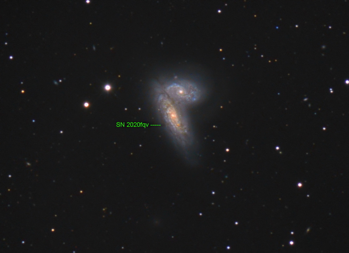 NGC 4567/8 ist ein wechselwirkendes Paar zweier Spiralgalaxien im Virgo-Galaxienhaufen. Die Galaxien werden auch Siamese Twins oder Butterfly Galaxies genannt. Sie sind von uns etwa 60 Millionen Lichtjahre entfernt. Nach SN 1990B (entdeckt am 20. Januar 1990) und SN 2004cc (entdeckt am 10. Juni 2004) ist SN 2020fqv (entdeckt am 31. März 2020) bereits die dritte Supernova in der Galaxie NGC 4568. Entdeckt wurde letztere mit der ZTF (Zwicky Transient Facility).