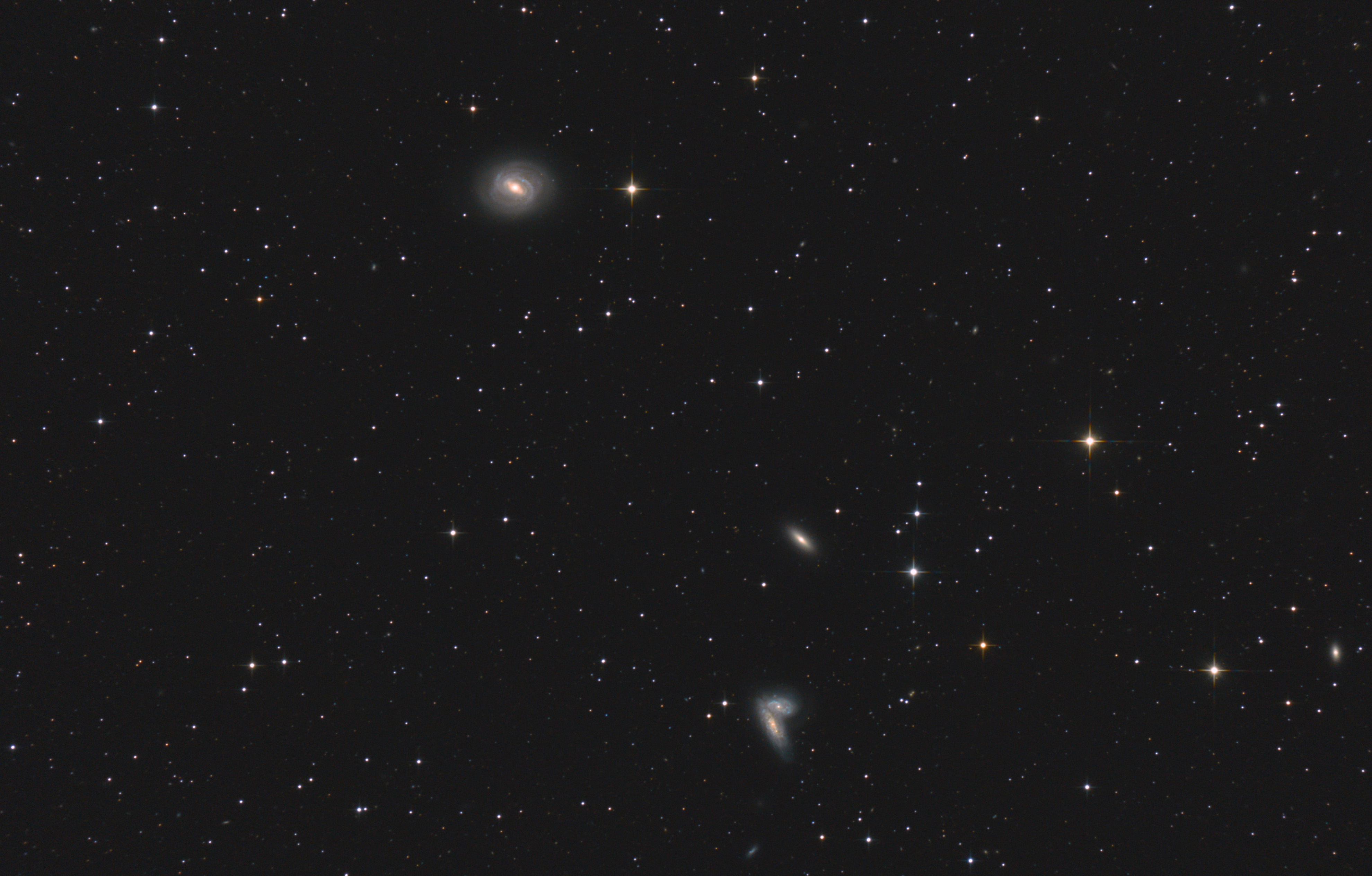 NGC 4567/4568 ist ein Paar zweier Spiralgalaxien im Virgo-Galaxienhaufen. Die Galaxien werden auch Siamese Twins oder Butterfly Galaxies genannt. Sie sind von uns etwa 60 Millionen Lichtjahre entfernt. NGC 4564 ist eine elliptische Galaxie, etwa 49 Millionen Lichtjahre entfernt und ca. 50.000 Lichtjahre im Durchmesser. M 58 (NGC 4579) ist eine 9,6 mag helle Balkenspiralgalaxie und damit eine der hellsten im Sternbild Jungfrau. Sie ist etwa 62 Millionen Lichtjahre entfernt.