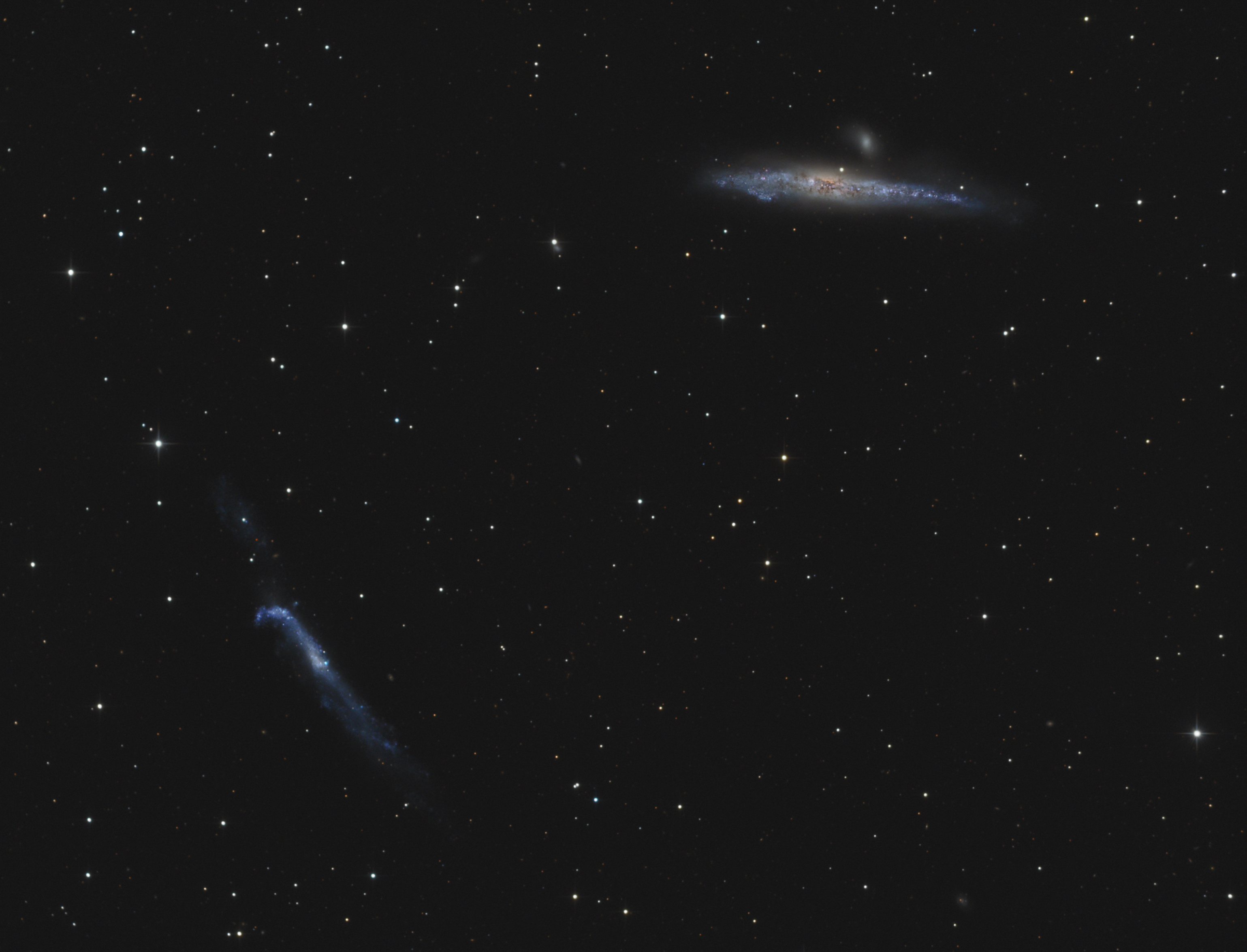 NGC 4631 und ihre kleine Nachbargalaxie NGC 4627 sind etwa 25 Millionen Lichtjahre entfernt in Blickrichtung zum Sternbild Canes Venatici. NGC 4631 ist etwa so groß wie unsere Milchstrasse und wurde 1787 von William Herschel entdeckt. Ihre Verformung resultiert zum Teil aus der Wechselwirkung mit NGC 4627. NGC4656/4657 ist eine Balkenspiralgalaxie im Sternbild Jagdhunde. Ihre charakteristische Form hat ihr die Bezeichnung »hockey stick« eingebracht. Die Galaxie stand in ihrer Vergangenheit offensichtlich in starker Wechselwirkung mit der Nachbargalaxiengruppe NGC 4631/ NGC 4627. Eine Auswirkung davon dürfte der helle Knoten am nordöstlichen Ende der Galaxie sein, der von Wilhelm Herschel als separates Objekt katalogisiert wurde, so dass auch im New General Catalogue eine eigene Nummer dafür vergeben wurde. Nach links oben ist auch noch ein schwacher Gezeitenschweif erkennbar.