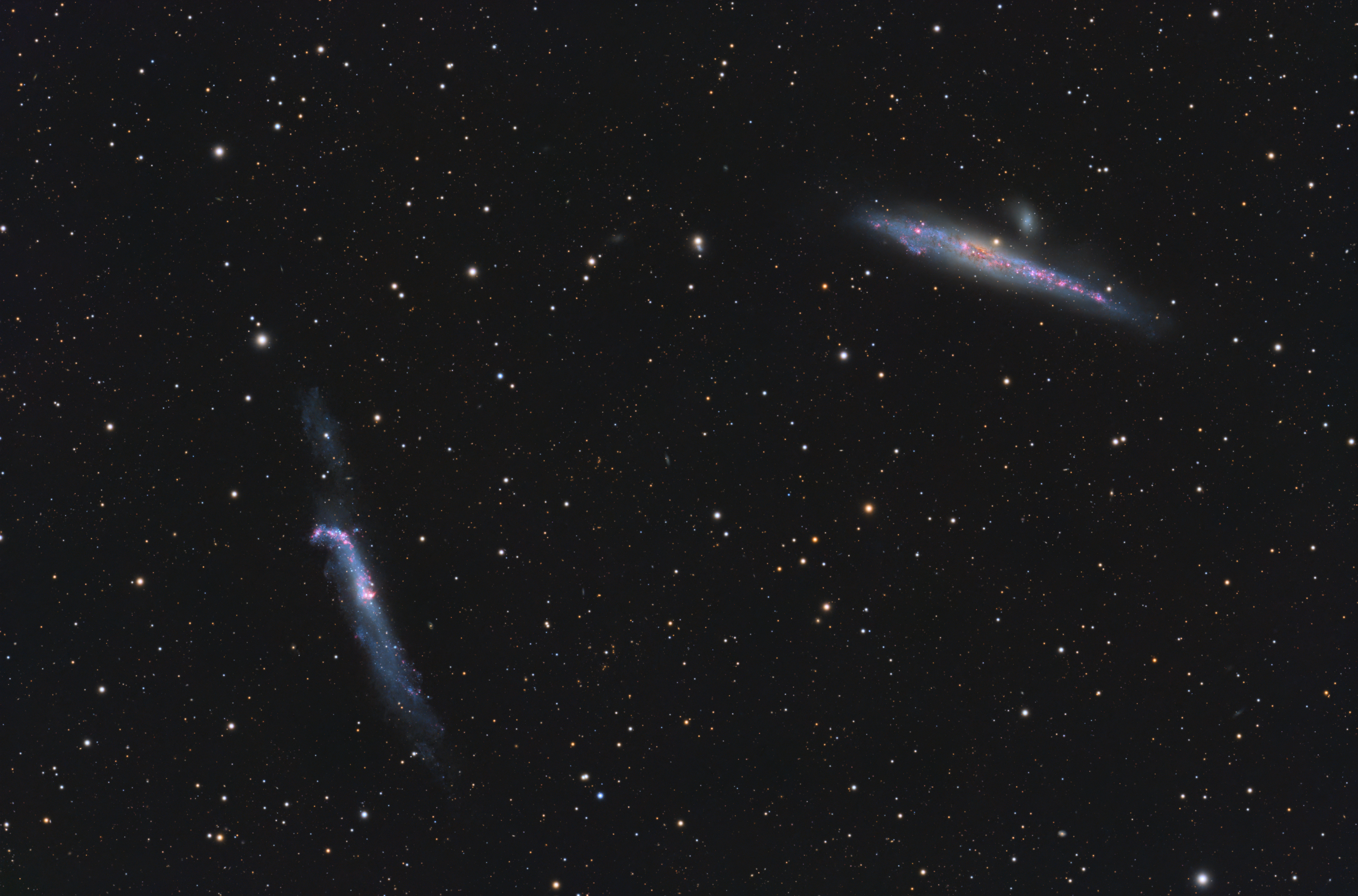 Im Sternbild Jagdhunde (Canes Venatici), etwa 30 Millionen Lichtjahre entfernt, präsentiert sich das Galaxienpaar NGC 4631 (Walgalaxie) und NGC 4656 (Brecheisengalaxie) in einem faszinierenden kosmischen Tanz. Die Walgalaxie ist eine kante von der Seite sichtbare Spiralgalaxie, deren Form an einen Wal erinnert. Sie ist von dunklen Staubbändern durchzogen und besitzt einen ausgedehnten Halo aus heißem Gas, der durch intensive Sternentstehung im Inneren entsteht. NGC 4656 hingegen zeigt eine stark verzerrte, gebogene Struktur, weshalb sie auch Brecheisengalaxie genannt wird. Ein heller Sternentstehungsknoten am einen Ende (ehemals NGC 4657 genannt) sowie ein schwacher fadenartiger Gegenschweif aus Sternen und Gas verdeutlichen die gravitativen Wechselwirkungen beider Galaxien. Diese Begegnung ist ein beeindruckendes Beispiel für dynamische Prozesse in kleinen Galaxiengruppen.