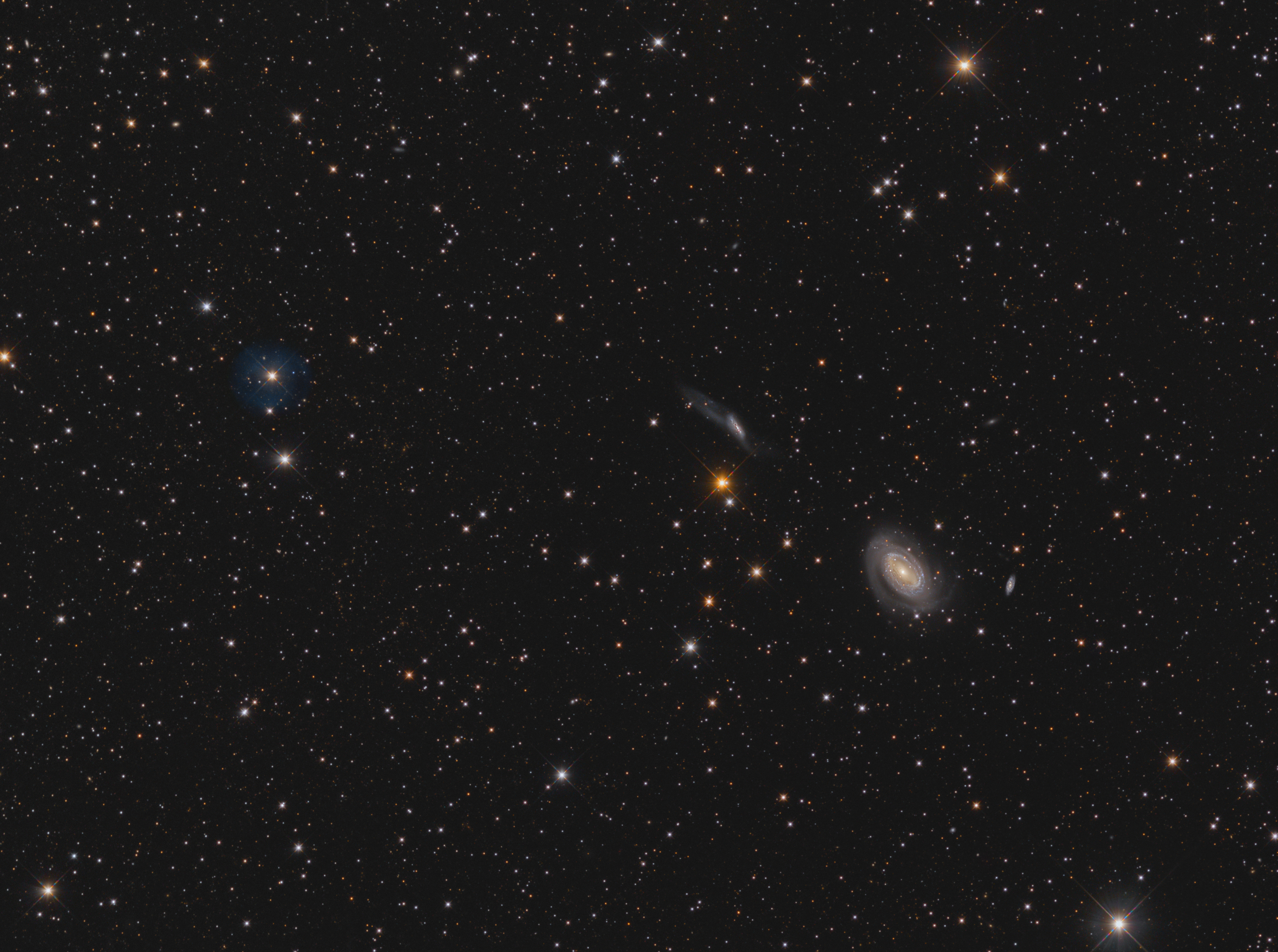 Die große Spiralgalaxie NGC 4725 und die etwa gleich weit entfernt befindliche NGC 4747 interagieren, was sich deutlich an den verzogenen Spiralarmen ablesen lässt. Östlich des Paares befindet sich der Planetarische Nebel LoTr 5, der eine intensive, blau-grüne Farbe zeigt. Beleuchtet wird er nicht vom hellen Stern mittig, sondern von dessen Zweigstern-Begleiter. Das Motiv diente als "first light" für ein neues Teleskop und gute Bedingungen ließen 20 Stunden Belichtungszeit zu.