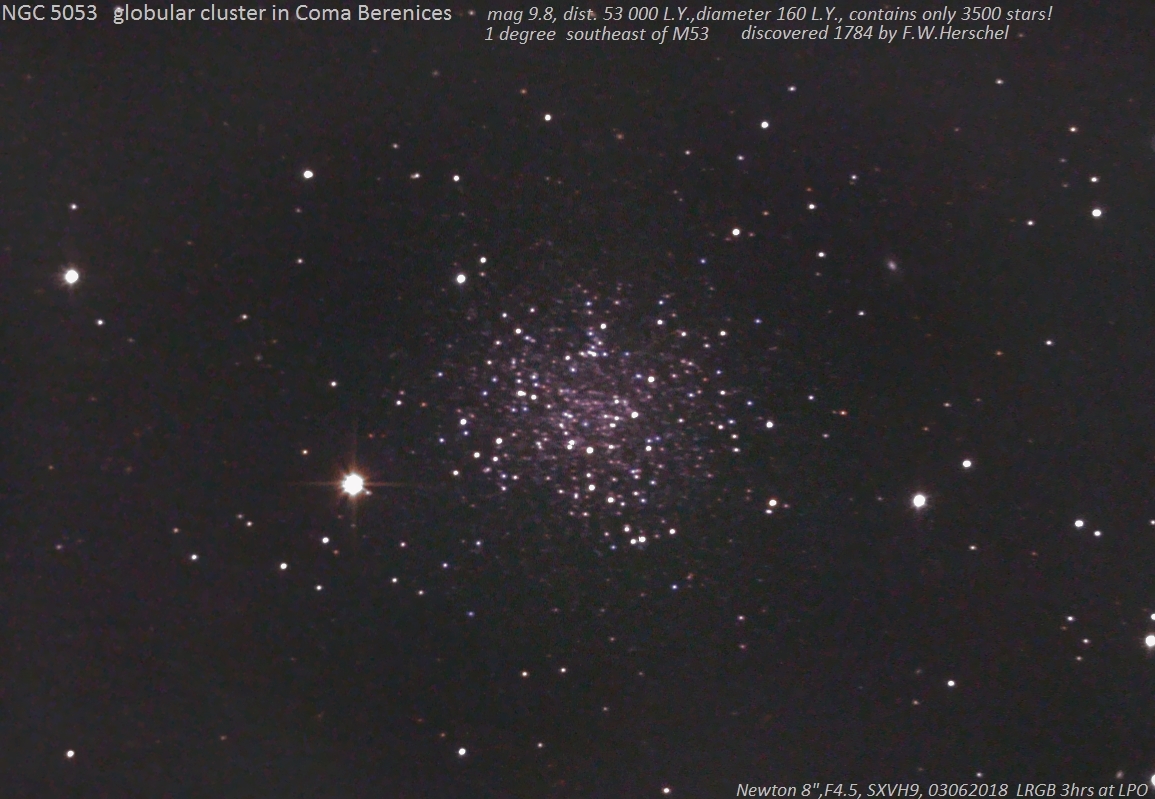 Der Kugelsternhaufen NGC 5053 befindet sich ein Grad südöstlich von M53 und ähnelt eher einem offenen Sternhaufen. Mit 9,8 mag ist er sehr schwach und wird selten fotografiert!