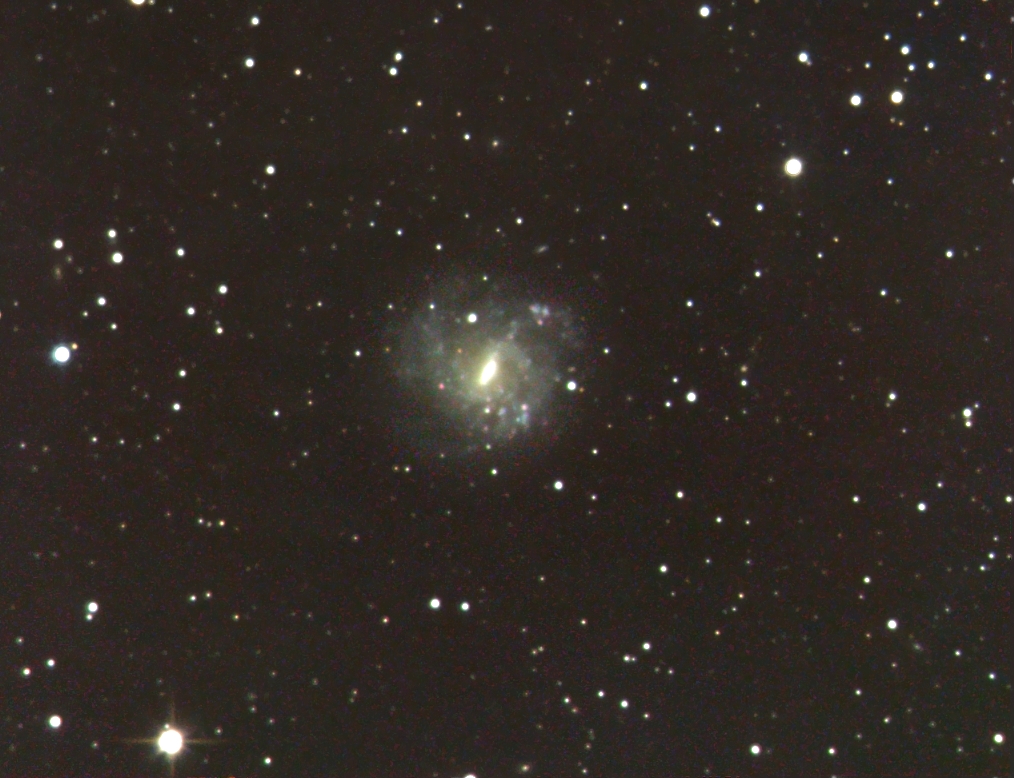 Drei Grad nördlich des 3 mag hellen Sterns Gamma Corvi, bei einer Deklination von -21 Grad, befindet sich diese an M83 erinnernde, aber um 2,5 mag schwächere (9,8 mag) und auch kleinere (7,3 x 6,4 Bogenminuten messende) schöne, fast face-on, Balkengalaxie NGC 5068 (Typ SBc). Sie ist ca. 24 Millionen Lichtjahre entfernt und hat einen wahren Durchmesser von 50000 (??)Lichtjahren. Entdecker war W. Herschel am 10. März 1785. Meine Aufnahme hat eine Belichtungszeit von 6h 30min und wurde in vier Sitzungen im Verlauf von fünf Jahren gewonnen. Bei jeder Session herrschten immer schlechte Seeingbedingungen! Wenn nämlich hier in meiner Gegend die Transparenz bis zum Horizont sehr gut ist, herrscht bei uns Südföhnlage, wobei die Sterne fast nicht zu fokussieren sind, herrscht hingegen Westwetterlage, so ist die Extinktion so groß, dass man sehr sehr lange belichten muss, was auch wieder zur Vergrößerung der Sternscheibchen führt. Deshalb zählt diese Galaxie zu den schwierigen Objekten bezüglich meiner örtlichen Aufnahmebedingungen. Eine eindrucksvolle Aufnahme gibt es vom Capella Observatorium (60-cm-Ganymed-Teleskop) aufgenommen in Zenitnähe in Namibia!!