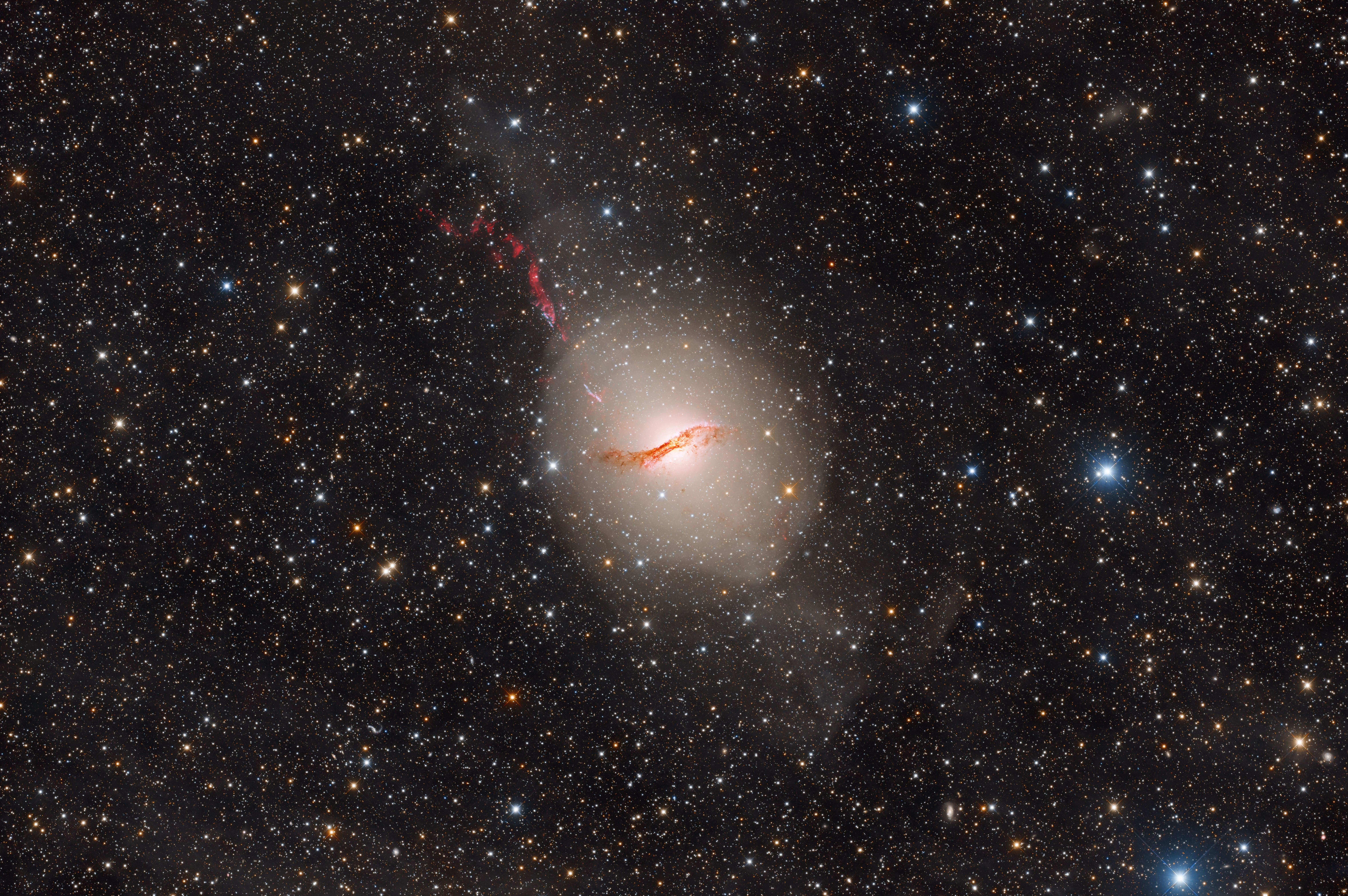 Im Frühjahr 2025 konnten wir, das Capella Team, das First Light unseres neuen Teleskops machen. Ziel für diese erste wirkliche Aufnahme war ein klassisches Objekt des Südhimmels: die Galaxie NGC 5128, besser bekannt als Centaurus A. Diese Bezeichnung verweist bereits auf ihre starke Emission im Radiowellenbereich. Centaurus A zählt zu den hellsten extragalaktischen Radioquellen am Himmel. Im Zentrum der Galaxie befindet sich ein extrem massereiches Schwarzes Loch, von dem ein sogenannter relativistischer Jet ausgeht. Die optischen Komponenten dieses Jets konnten wir durch Aufnahmen mit schmalbandigen Hα- und OIII-Filtern abbilden. Der hellste Teil dieses Jets erstreckt sich dabei in nordöstlicher Richtung. Sehr schwach ist auch der Gegenjet dieser bipolaren Struktur am südwestlichen Rand des Galaxienkörpers erkennbar Bei dem Bild wurde die Technik der Kontinuum-Subtraktion angewandt, um das Ha- und das OIII-Signal deutlich vom Kontinuum der Galaxie zu trenne Centaurus A ist für das markante Staubband bekannt, das sich durch den zentralen Teil der Galaxie zieht. Ansonsten weist die Galaxie kaum Strukturen auf, was typisch für eine elliptische Galaxie wäre Der Astrofotografiepionier David Malin hat in den 1980er Jahren auf einer Aufnahme von Centaurus A etwas Ungewöhnliches feststellen können, als er das Bild mit einem unscharfe-Maske-Filter bearbeitet hat. Durch diese lokale Kontrastanpassung kamen Schalenstrukturen im Galaxienkörper zum Vorschein, die bis dahin nicht bekannt waren. Diese Schalenstrukturen lieferten Hinweise auf einen Zusammenstoß von Centaurus A mit einer anderen Galaxie. Insgesamt könnte das auch die hohe Sternentstehung und die Aktivität der Galaxie erklären Farblich erkennt man bei Centaurus A deutlich eine Rötung. Diese hat vermutlich mehrere Ursachen. Zum einen hängt sie mit der Sternpopulation der Galaxie zusammen, die viele rote Sterne aufweist. Zum anderen ist der Effekt bedingt durch Extinktion, also die Abschwächung kurzwelliger Lichtfrequenzen durch Staub – sowohl innerhalb der Galaxie selbst als auch aufgrund ihrer Lage am Himmel.