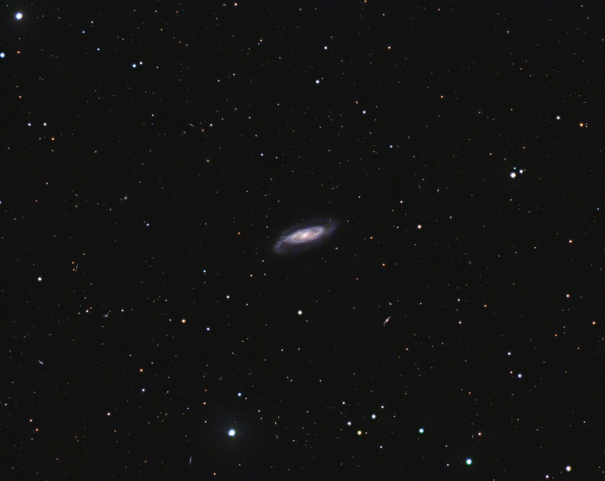 NGC 5448 ist eine interessante Spirale in der südöstlichen Ecke vom Großen Bären (Ursa Major). Nach der Rotverschiebung ist sie 100 Millionen Lichtjahre entfernt, doch die Tully-Fisher-Messungen ergeben eine durchschnittliche Entfernung von etwa 120 Millionen Lichtjahren. Das ist eigentlich eine recht gute Übereinstimmung. Bei einer Entfernung von 100 Millionen Lichtjahren hat sie einen Durchmesser von etwa 120.000 Lichtjahren, was sie zu einer ziemlich großen Spirale macht. Das NED klassifiziert sie als (R)SAB(r)a mit und ohne AGN (Aktiver Galaktischer Kern). Das NGC-Projekt ist da anderer Meinung und bezeichnet sie einfach als SBb. Sie hat eine schwache äußere Scheibe jenseits eines hellen ringförmigen Merkmals, das von ihren Spiralarmen gebildet wird, die sich fast überlappen. Für mein Auge erscheint die äußere Scheibe Richtung Osten verzogen. Das könnte eine Täuschung sein. In keiner der Abhandlungen, die ich gefunden habe, wird eine Verwerfung erwähnt. Entdeckt wurde die Galaxie von William Herschel am 15. Mai 1787. Sie hat einen Eintrag in seinem zweiten H400-Programm.