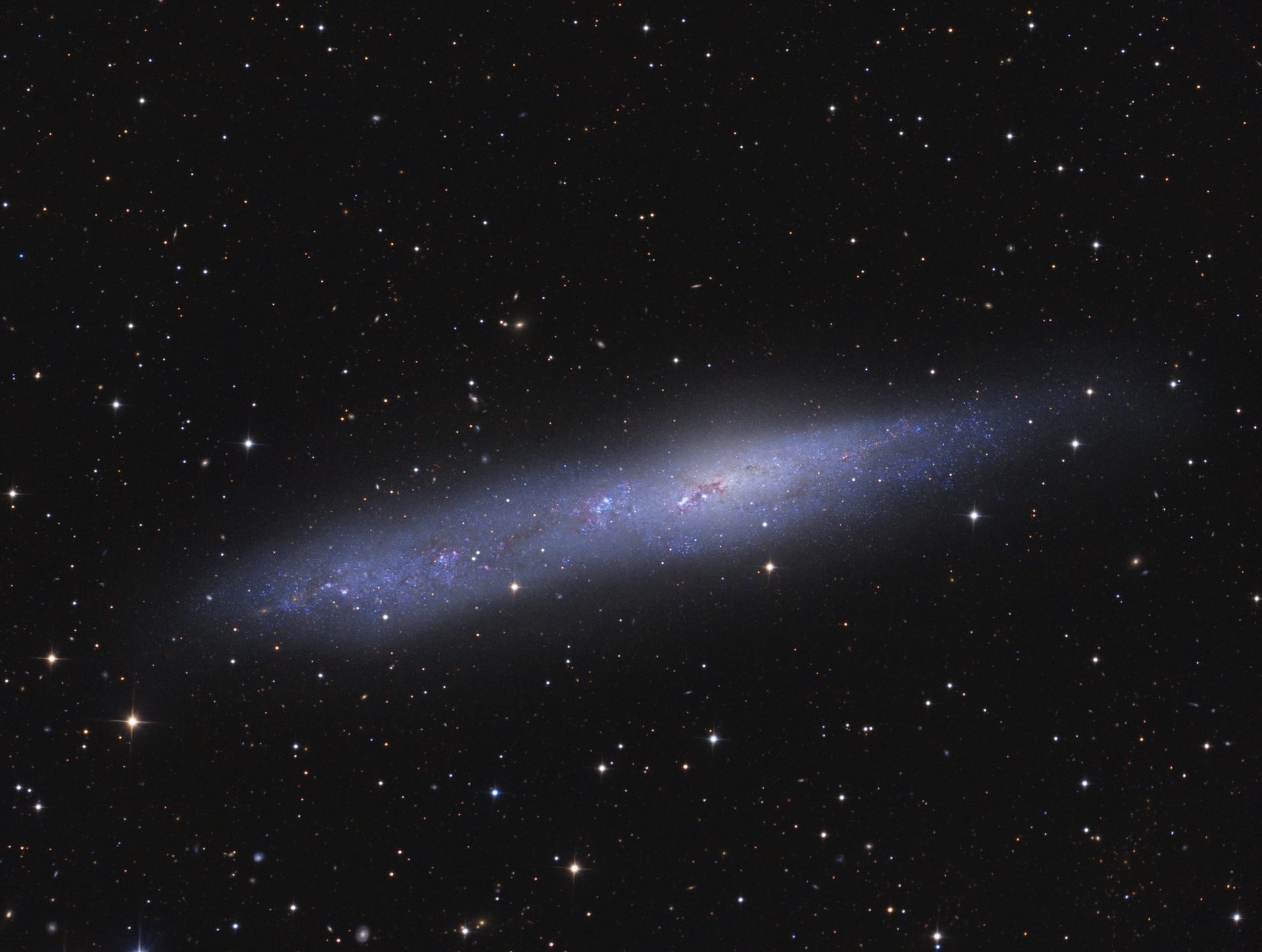 NGC 55 ist eine fast von der Seite sichtbare Galaxie und erscheint asymmetrisch mit einigen Knoten und Staubbahnen. Eine absolut außergewöhnliche Galaxie im Sternbild Bildhauer.