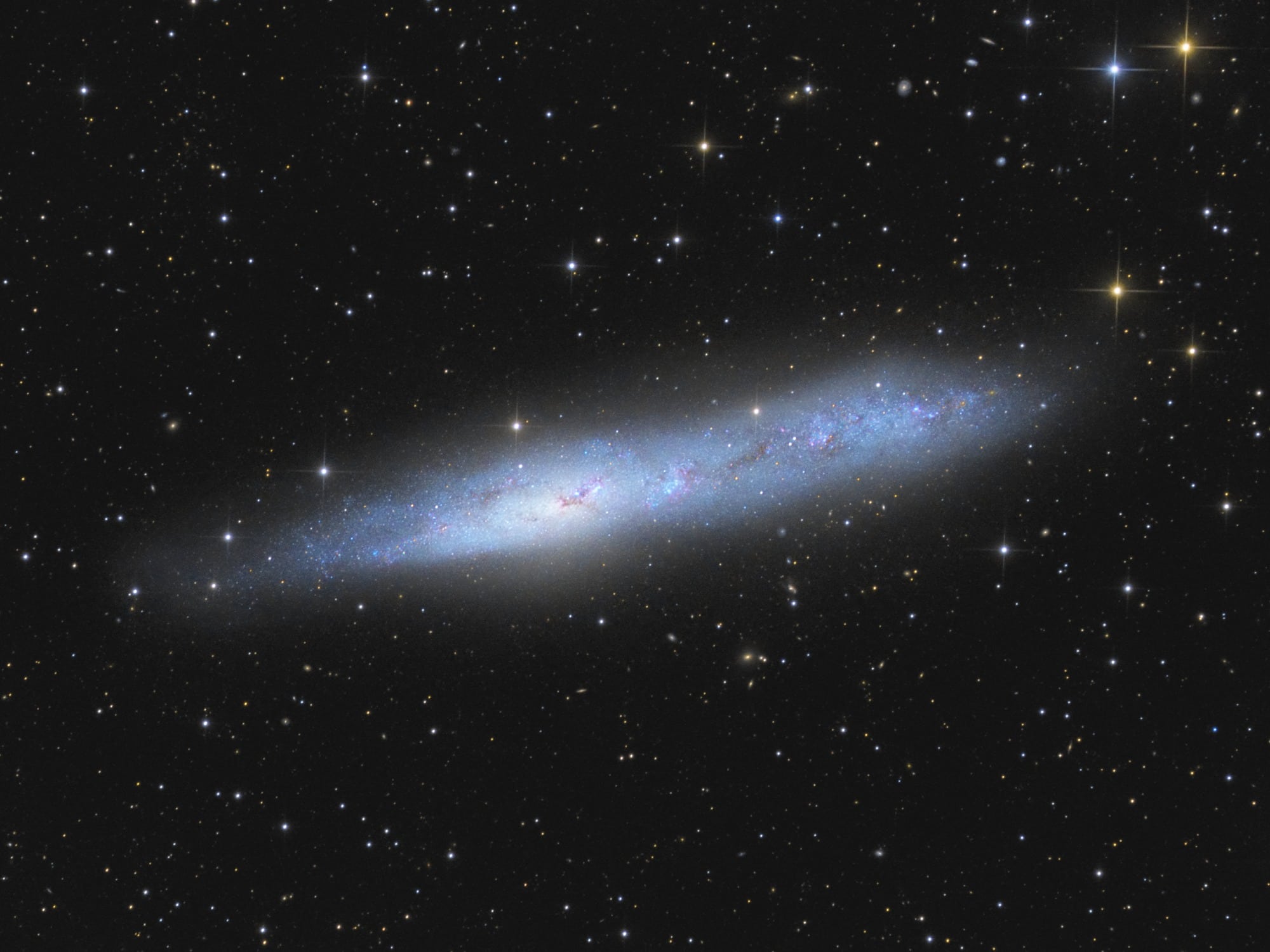Die Galaxie NGC 55 liegt im Sculptor nahe der Grenze zum Phoenix, eine der nahesten Galaxien außerhalb der lokalen Gruppe. Mit rund sieben Millionen Lichtjahren ist sie der Sculptor-Gruppe, der sie zugerechnet wird, noch etwas vorgelagert. Es ist eine SB-Spirale die wir von der Seite her sehen, und sie ist groß - der diffuse Strich umfasst einen vollen Monddurchmesser. Zahlreiche blaue Riesensterne sind aufgelöst und auch einige der großen HII-Gebiete sind sichtbar.