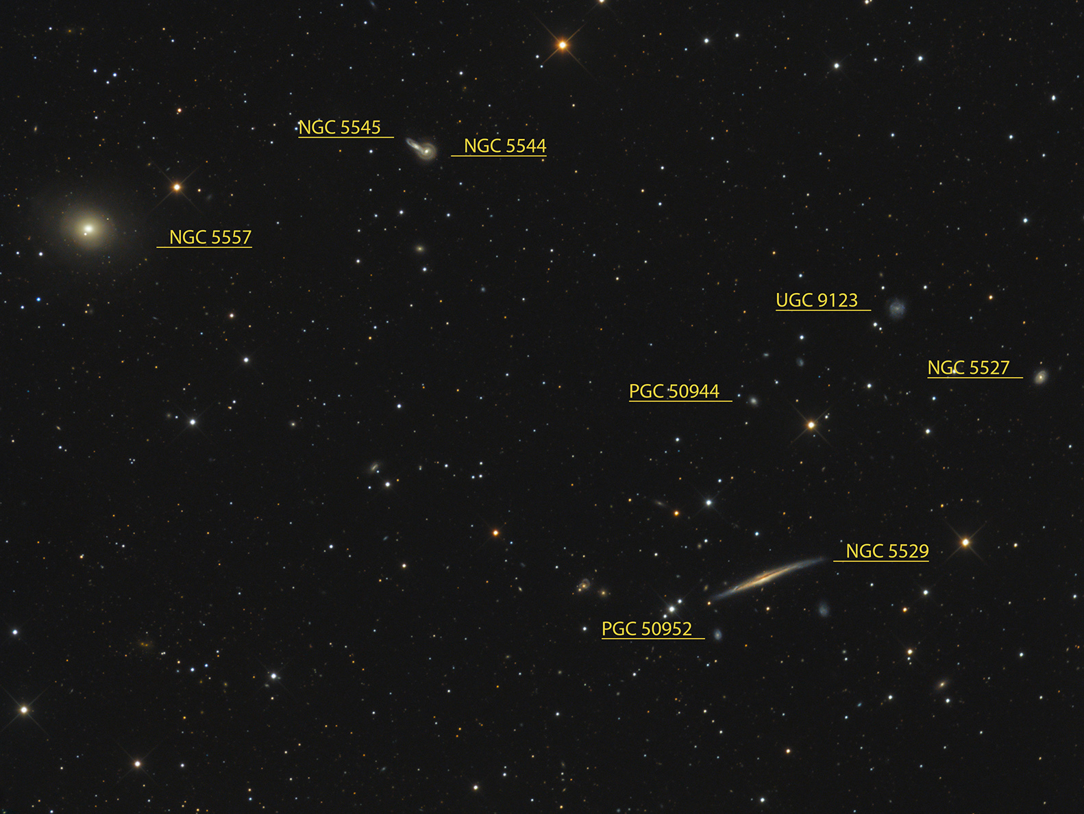 NGC 5529 ist eine Spiralgalaxie vom Hubble-Typ Sc im Sternbild Bärenhüter und ist ca. 140 Millionen Lichtjahre entfernt. Ihr Durchmesser von 250000 Lichtjahren bedeutet die doppelte Größe unserer Galaxie. Die Form des Kerns und der geschwungene Verlauf der Scheibenebene deuten auf eine frühere Wechselwirkung mit einer anderen Galaxie hin. NGC 5557 links oben im Bild ist eine elliptische Galaxie mit ca. 132 Mio. Lichtjahren Entfernung. Bemerkenswert ist der schwach leuchtende äußere ringförmige Hof um die Galaxie. Das wechselwirkende Paar NGC 5544 und NGC 5545 ist auch als Arp 199 katalogisiert.