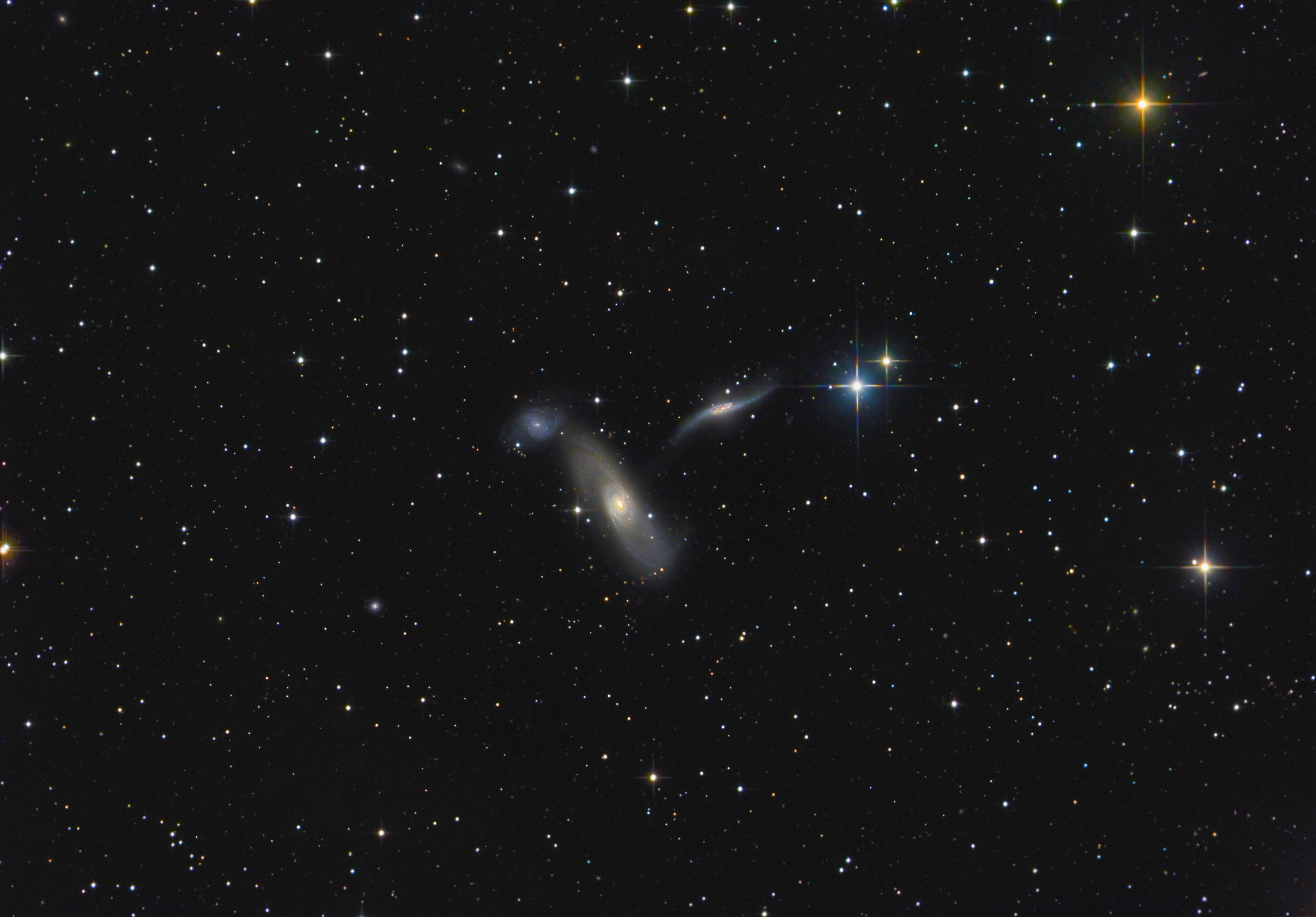 Die Galaxiengruppe um NGC 5566, die auch als WBL 501 bezeichnet wird, sind offensichtlich untereinander in Wechselwirkung. Die große Balkenspirale reicht mit ihrem langen Spiralarm an die nördliche NGC 5569 heran. Diese wird von blauen Sternen in ihrer Spirale dominiert. Auf der westlichen Seite streckt NGC 5560 ihre langgezogenen Spiralarme nach der größeren Nachbarin aus. Sie ist zudem noch in einem Sternenschleier eingehüllt. Darüber hinaus sind im Hintergrund viele entfernte Galaxien zu finden. Das Bild ist über mehrer Nächte belichtet, die RGB-Aufnahme stammt aus dem Jahr 2018.